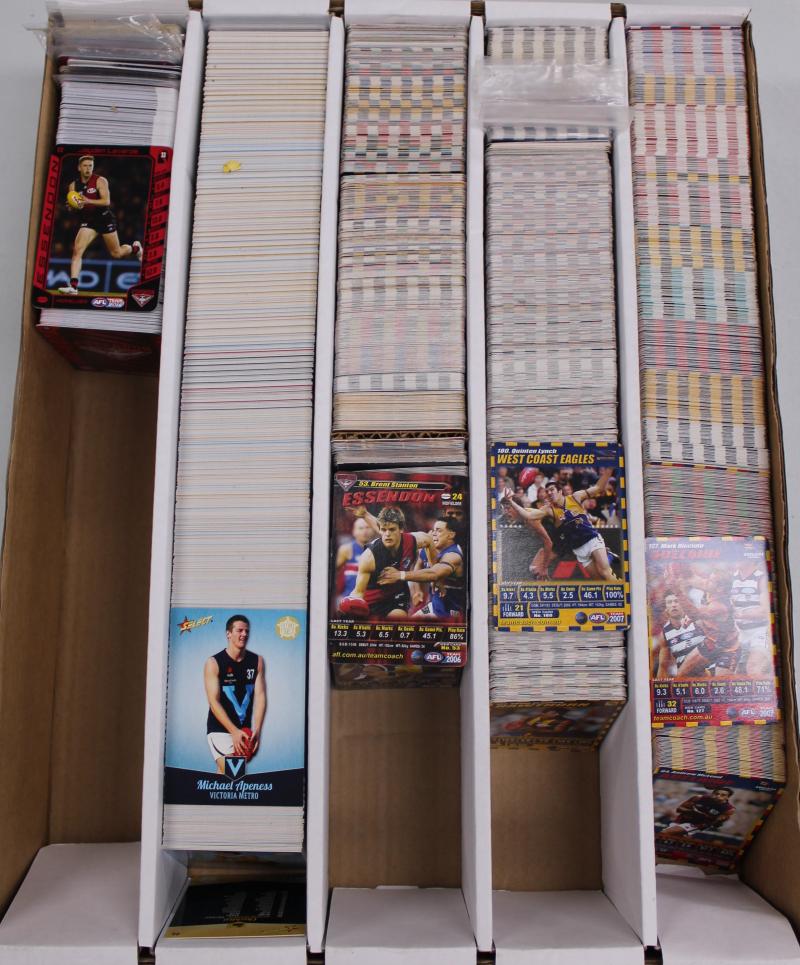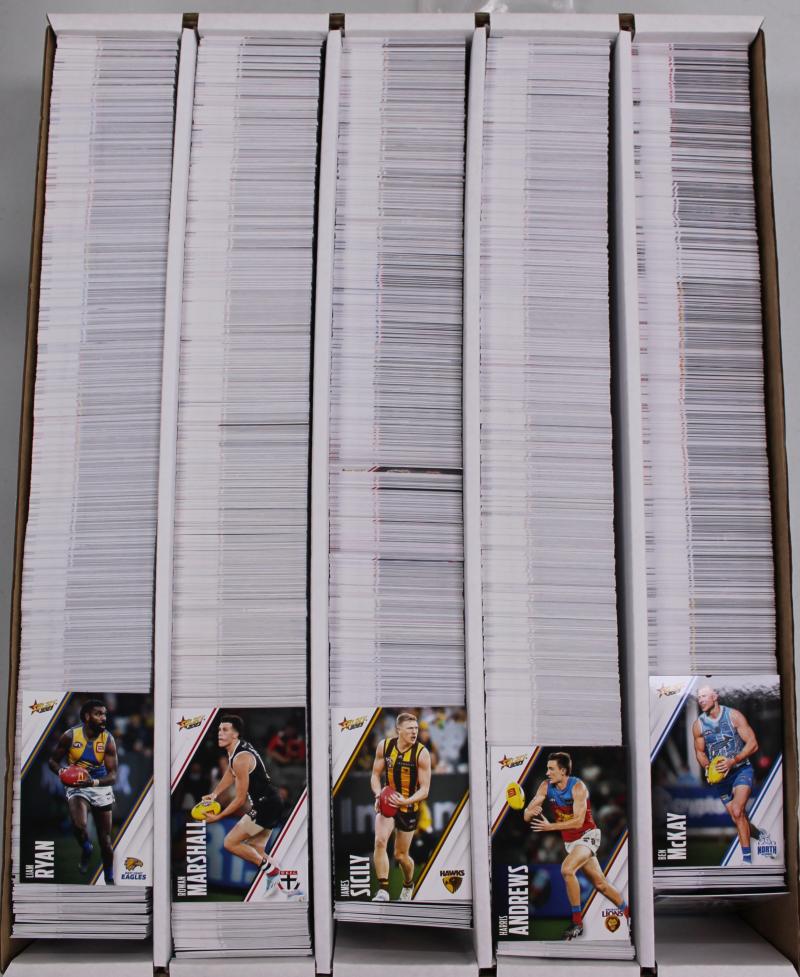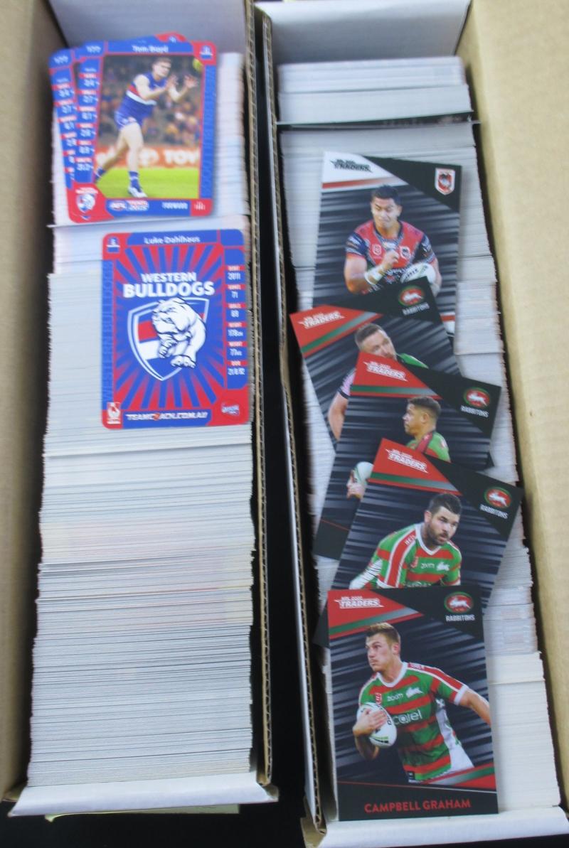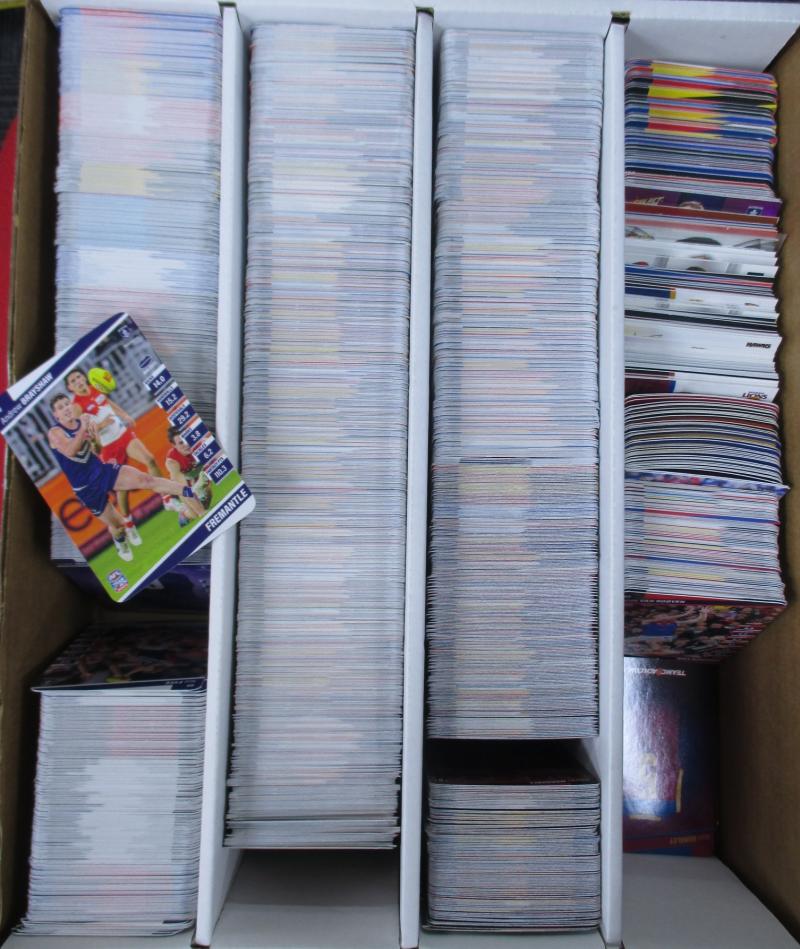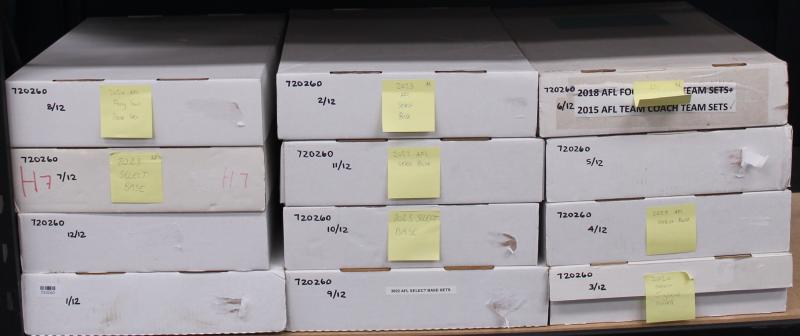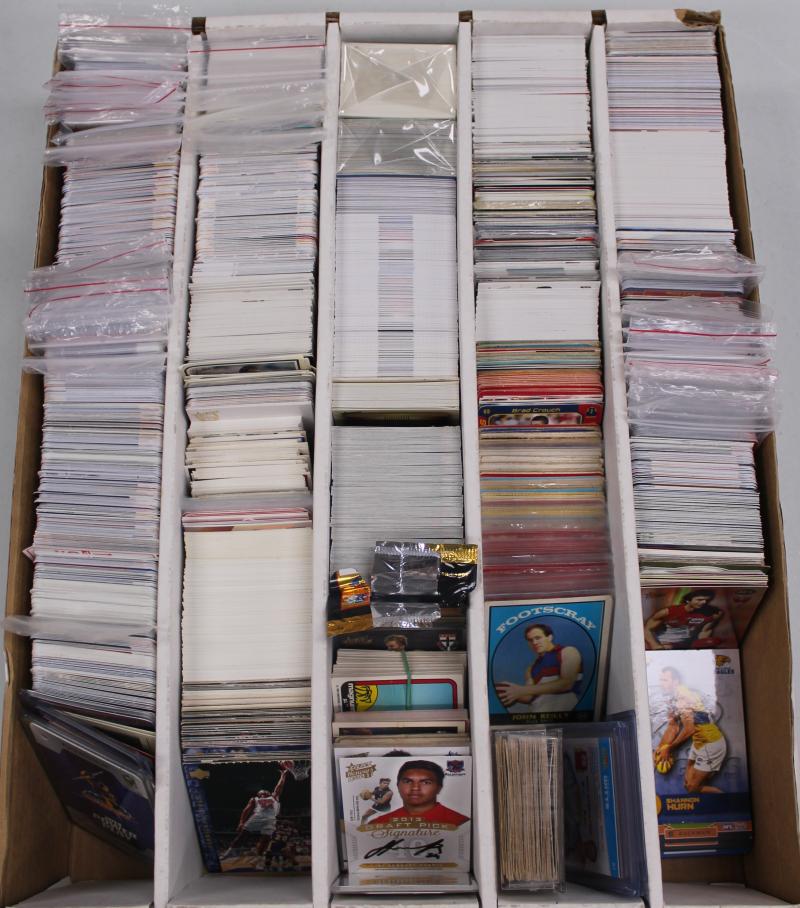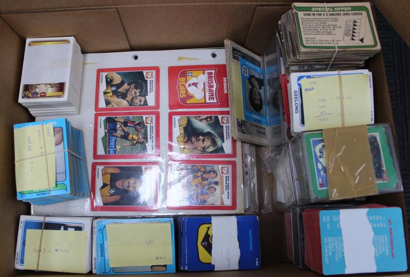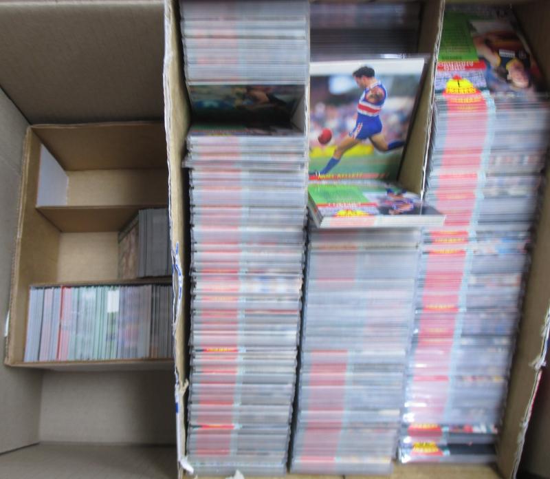 Huge accumulation 1973-2024 in 12 count boxes, noted few Scanlens, mainly modern cards; also few cricket, NRL, basketball, mainly