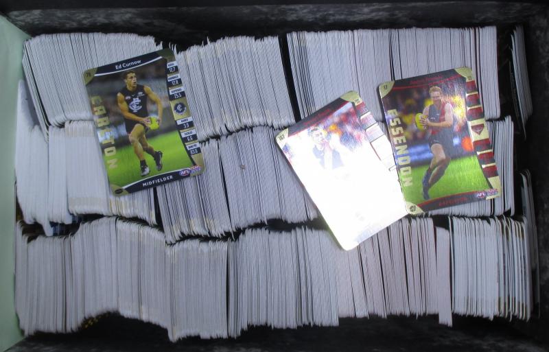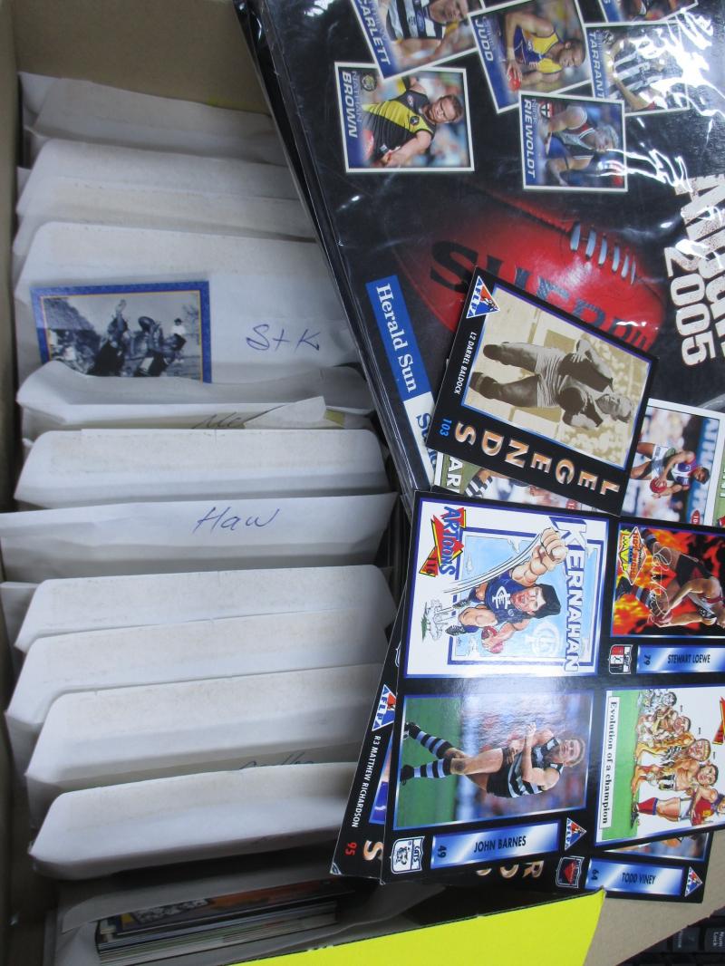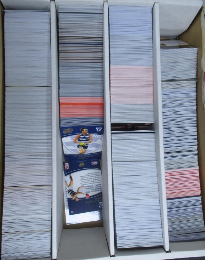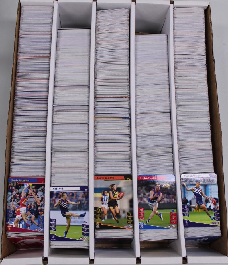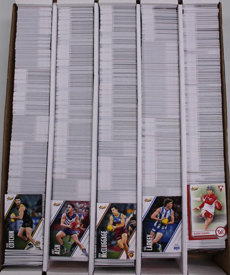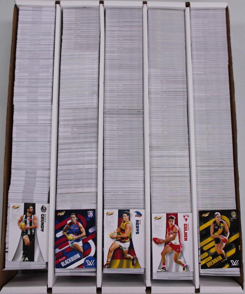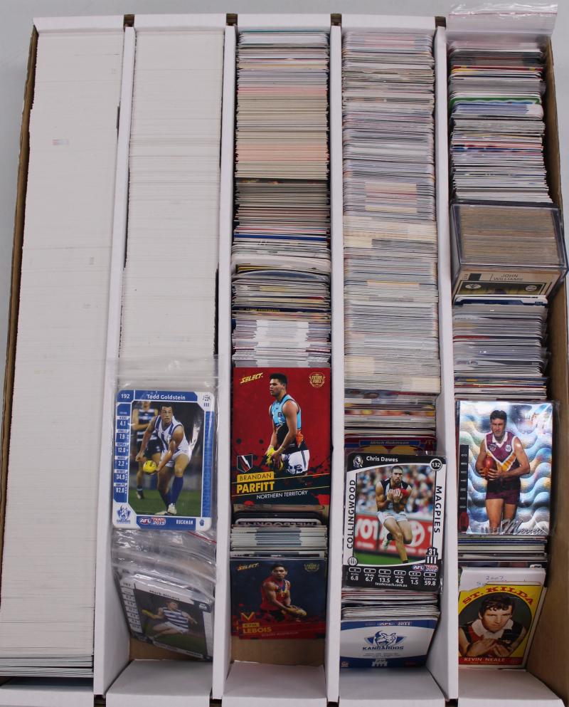Huge accumulation 1973-2024 in 12 count boxes, noted few Scanlens, mainly modern cards; also few cricket, NRL, basketball, mainly