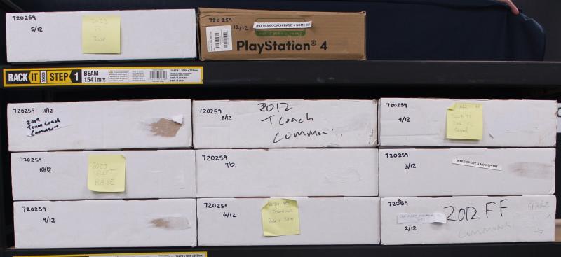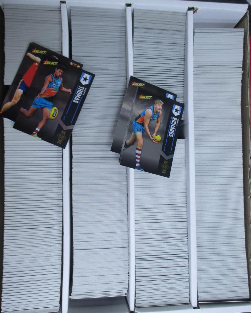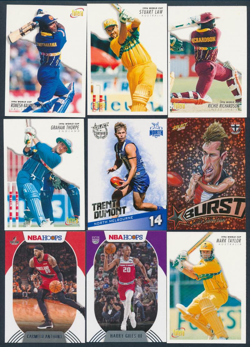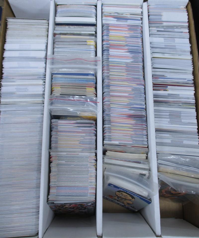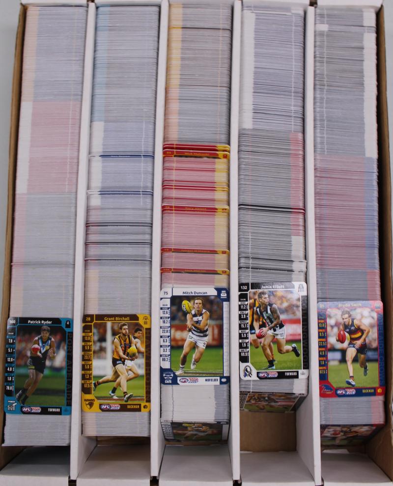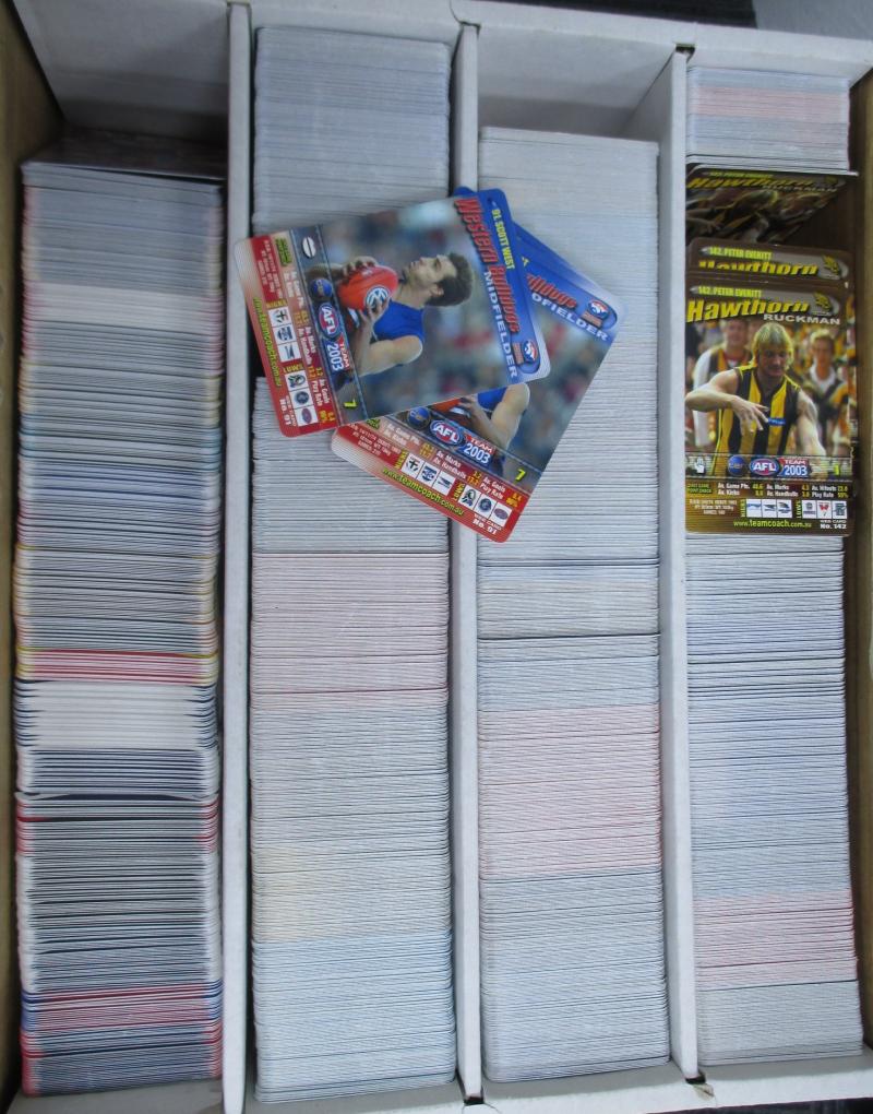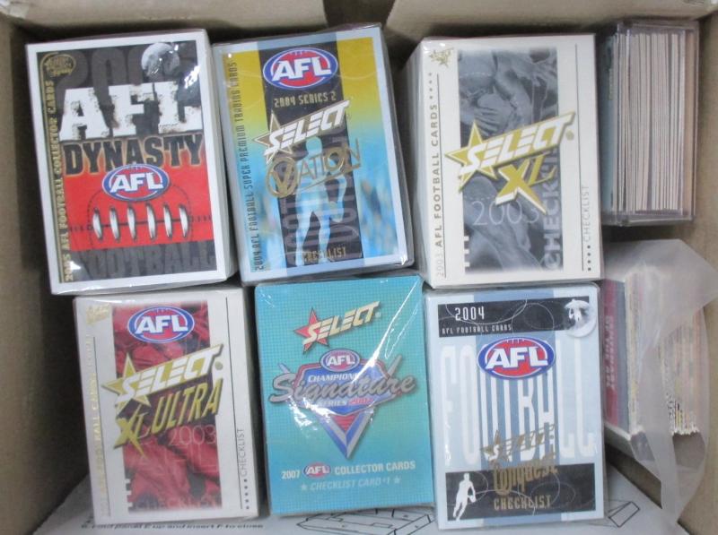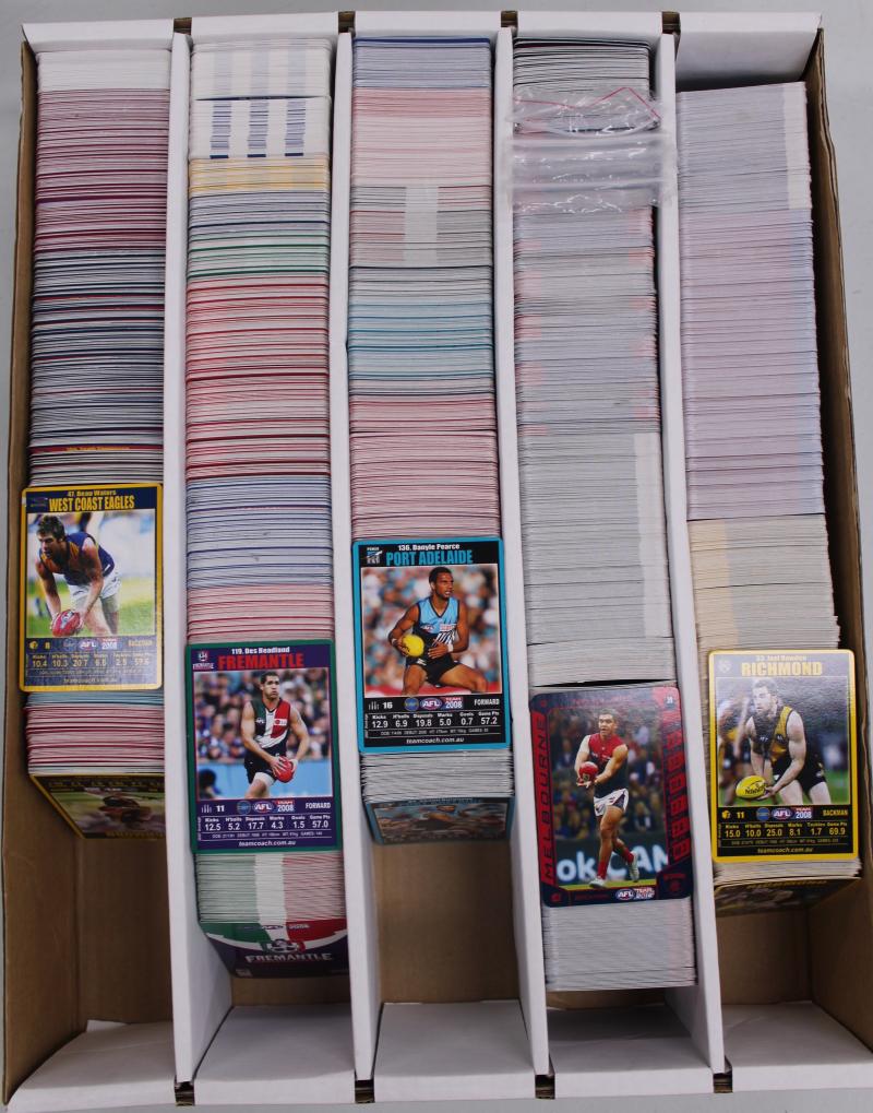 Huge accumulation 1973-2024 in 12 count boxes, noted few Scanlens, mainly modern cards; also few cricket, NRL, basketball, mainly