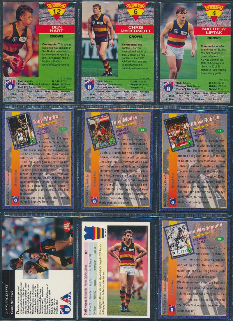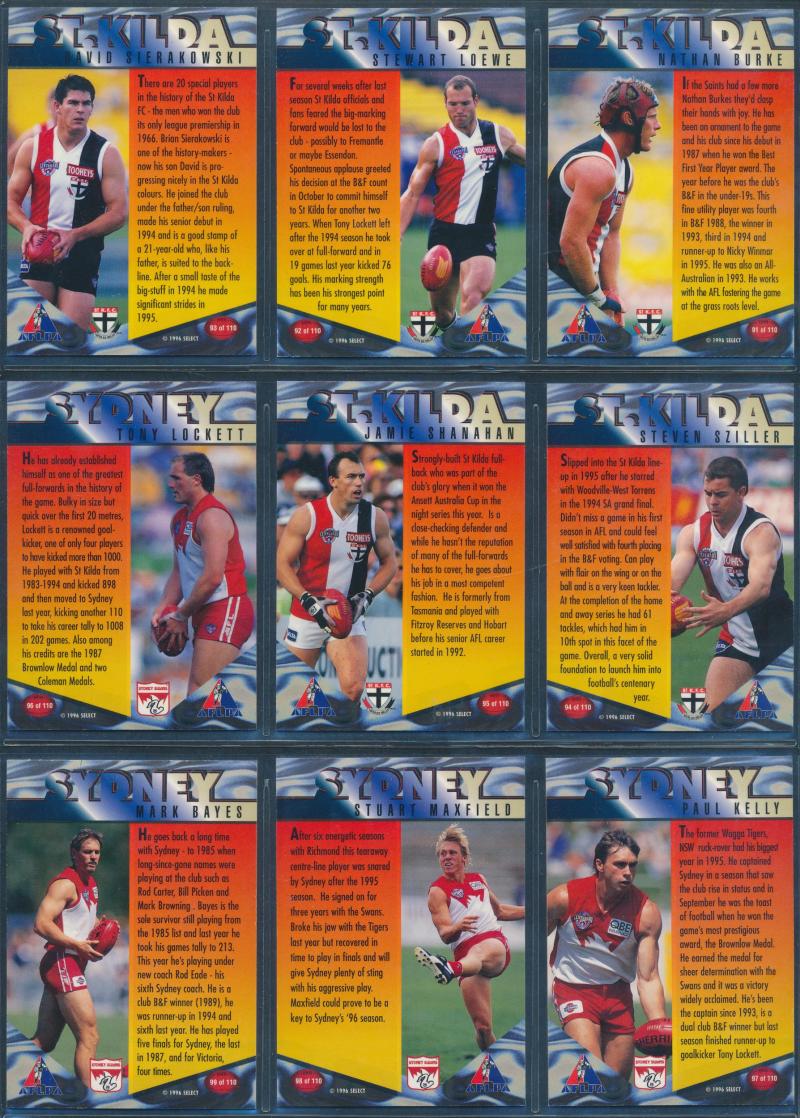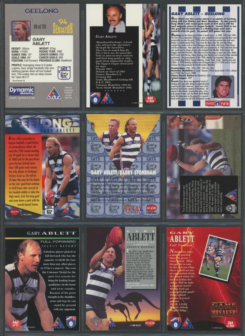 StKilda; 1992 Regina [176]; 1993 Select [192]; Gary Ablett Sr cards (23 - one signed), mainly Fine/Very Fine.