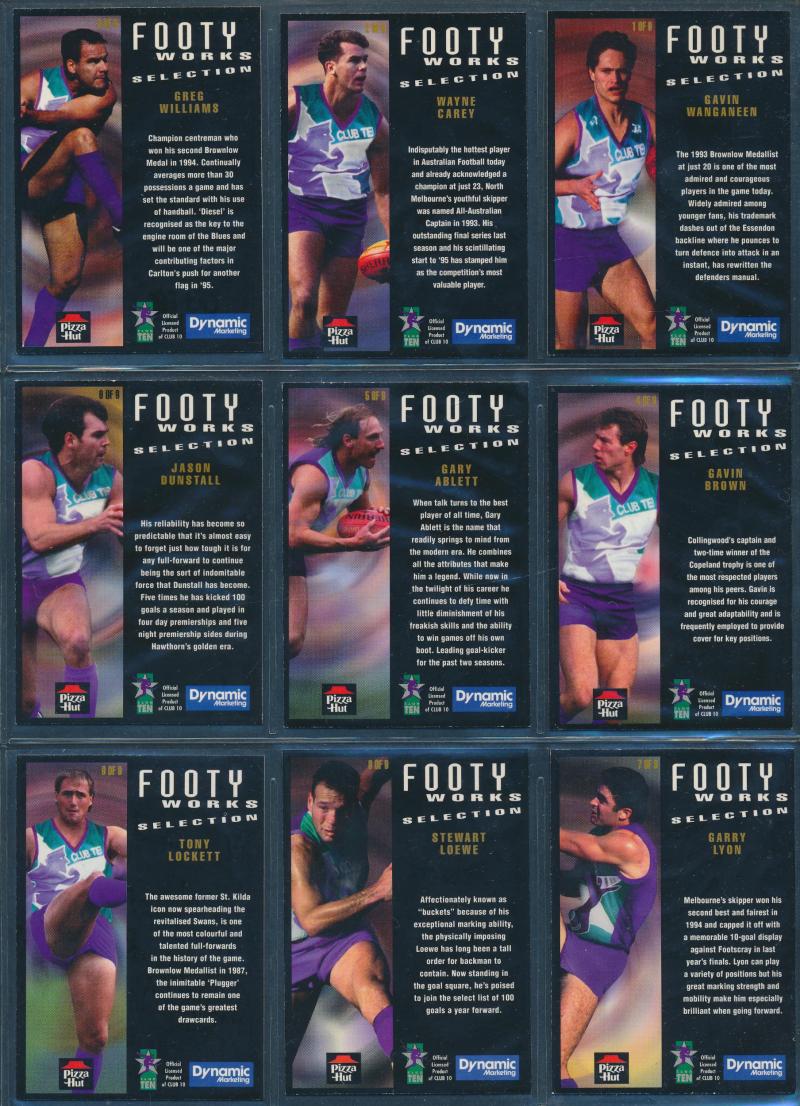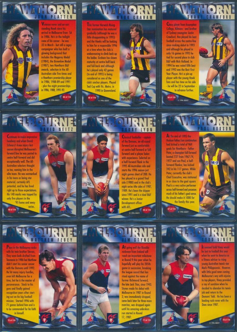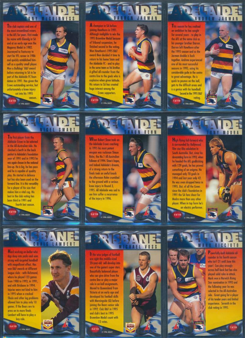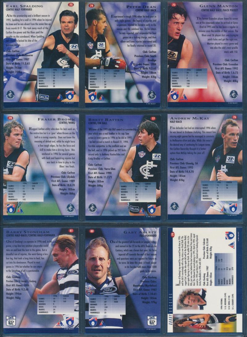 'Footy's Finest' [10]; 1996 Select 'Best & Fairest' [16] & 'Classic Metal Gold Parallel' [110]; 1996 McDonalds 'Learn from the Stars' [12]; 1996 QBE 'Super Swans' [13]; 1997 Select 'All Australian' [22] & 'Head to Head' [12], mainly fine/Very Fine.