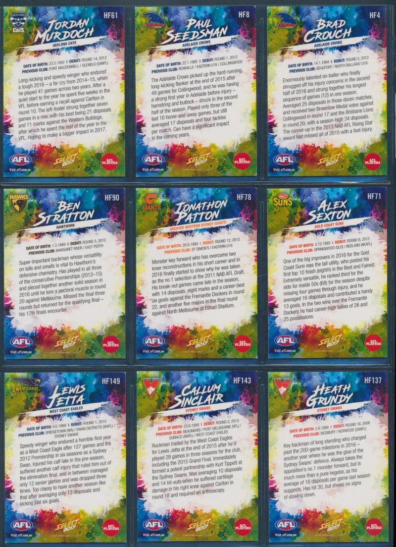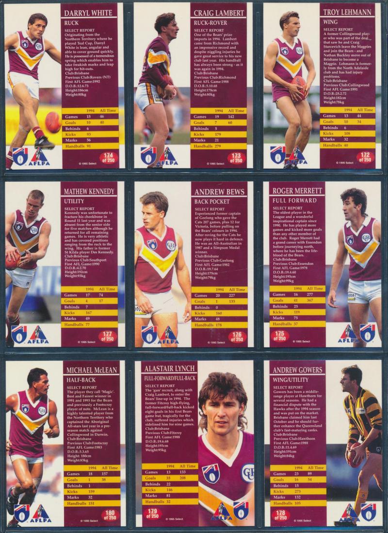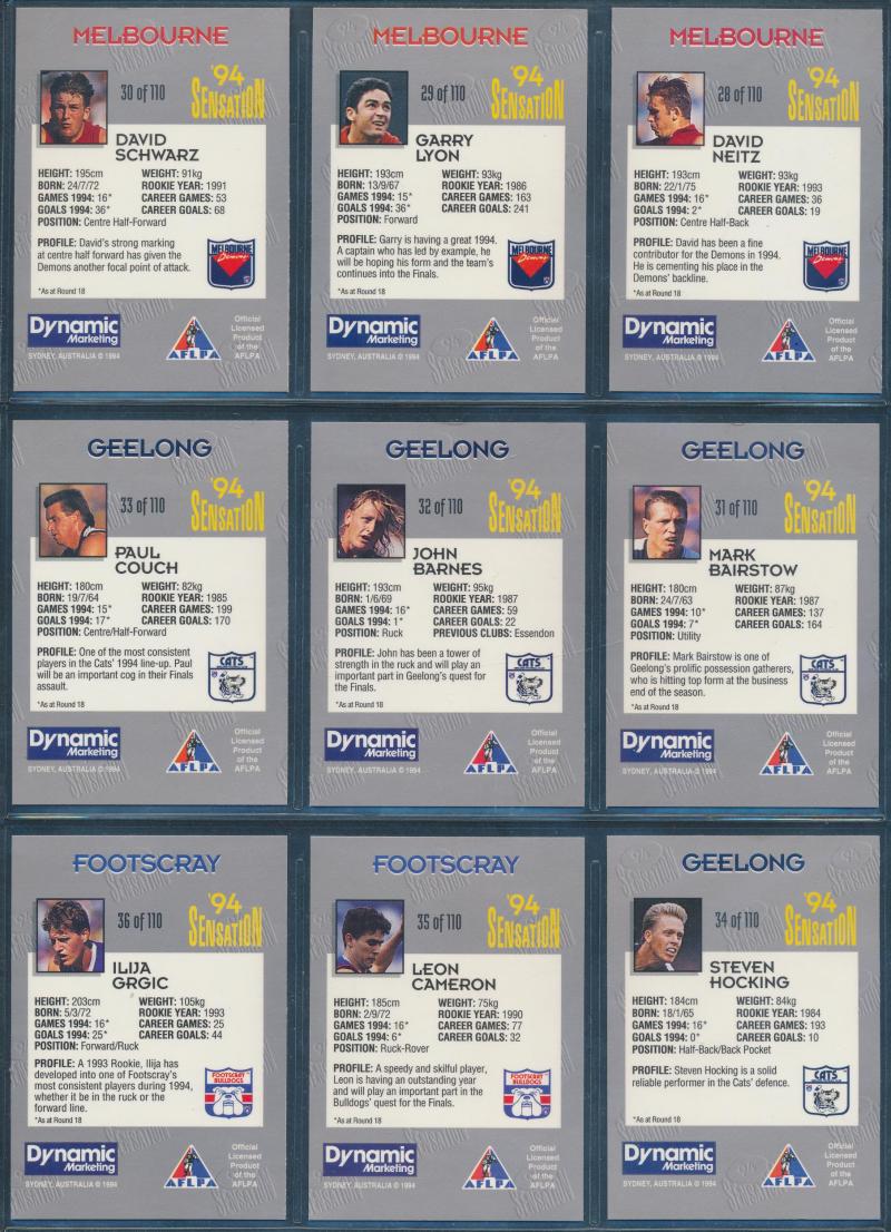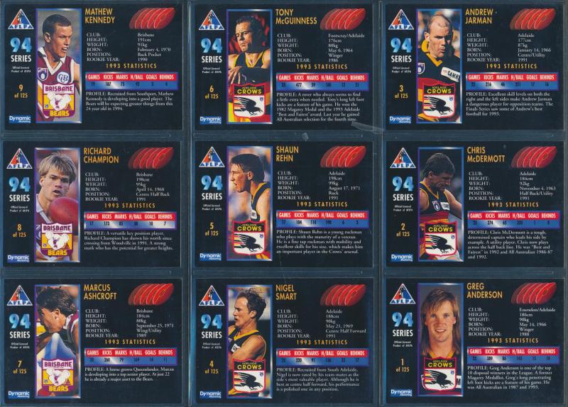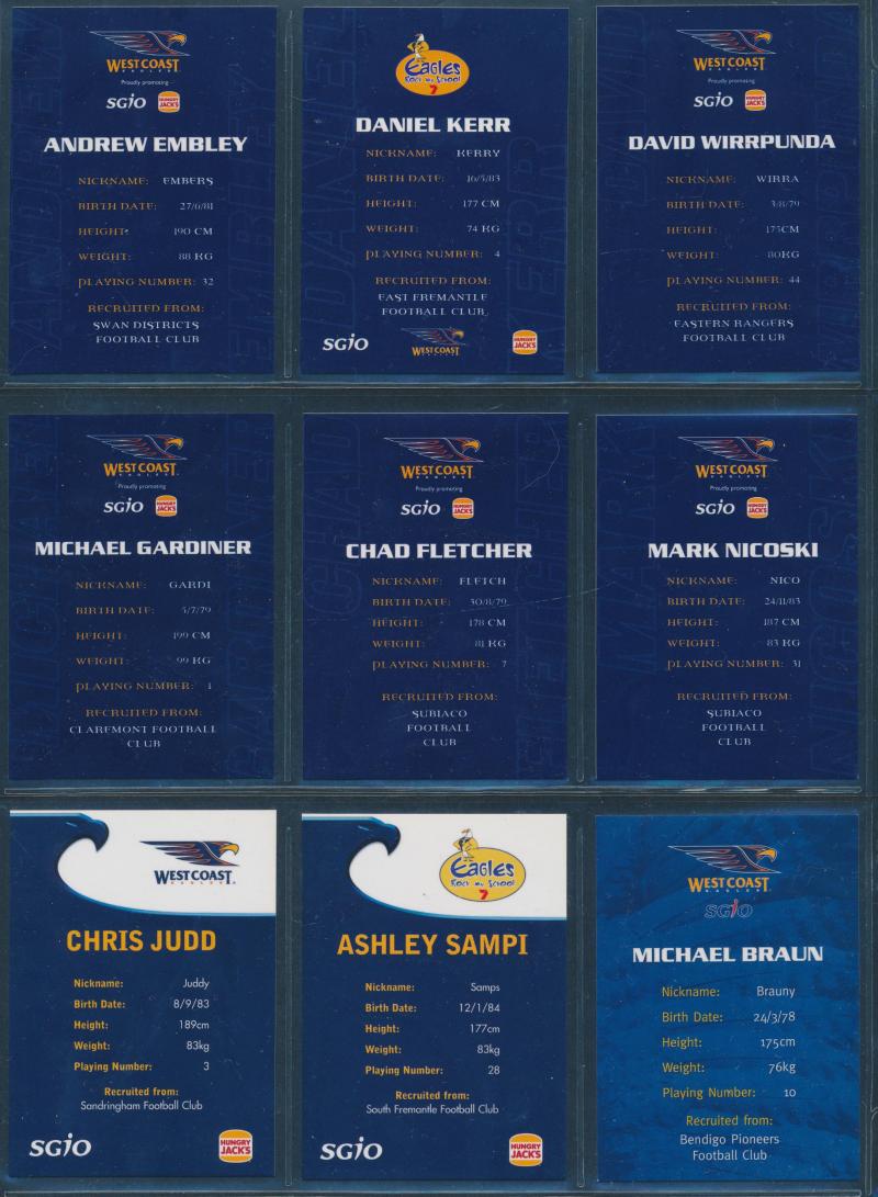 'Footy's Finest' [10]; 1996 Select 'Best & Fairest' [16] & 'Classic Metal Gold Parallel' [110]; 1996 McDonalds 'Learn from the Stars' [12]; 1996 QBE 'Super Swans' [13]; 1997 Select 'All Australian' [22] & 'Head to Head' [12], mainly fine/Very Fine.
