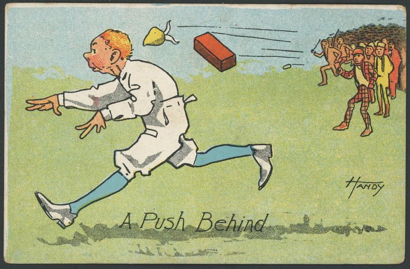 Postcards 1906 Handy 'Football Sayings Cartoon Postcards' [1/9 known] titled "A Push Behind"; 1904 postcard "Our Team Won" endorsed