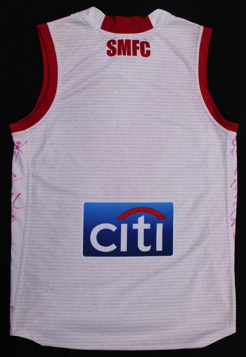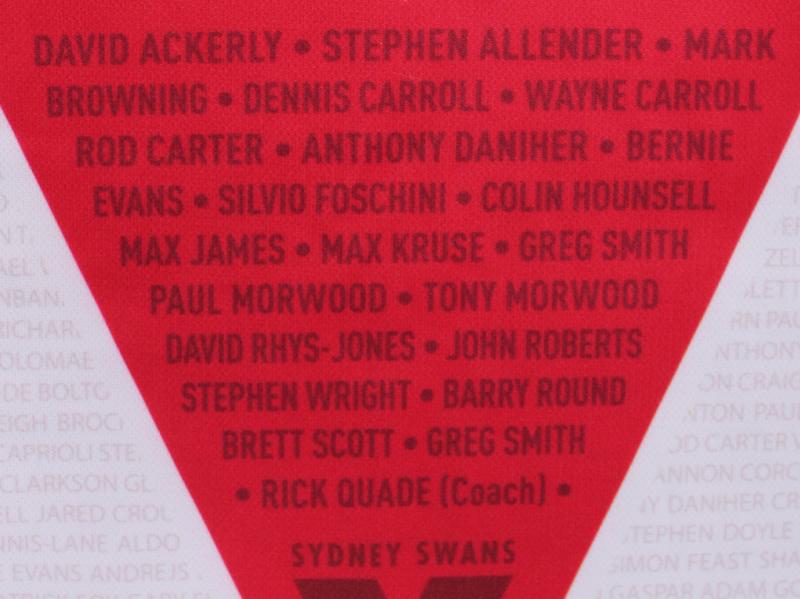 jumper is a limited edition to commemorate the club's 30 years in Sydney. It is a replica of the jersey worn in the team's first match in 1982, and honours all 299 players who represented the Swans between 1982 and 2011]. (Image1) (Image2)