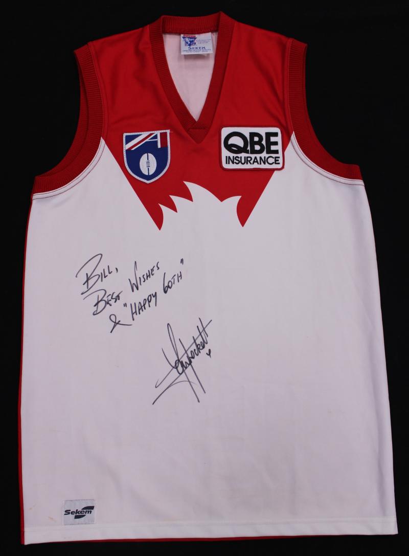 SYDNEY SWANS: Sydney jumper signed "Bill, Best Wishes & Happy 60th, Tony Lockett"; plus Sydney polo signed "To Bill, Tony Lockett".