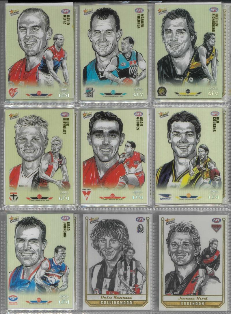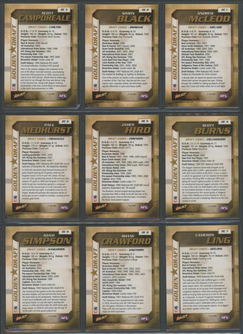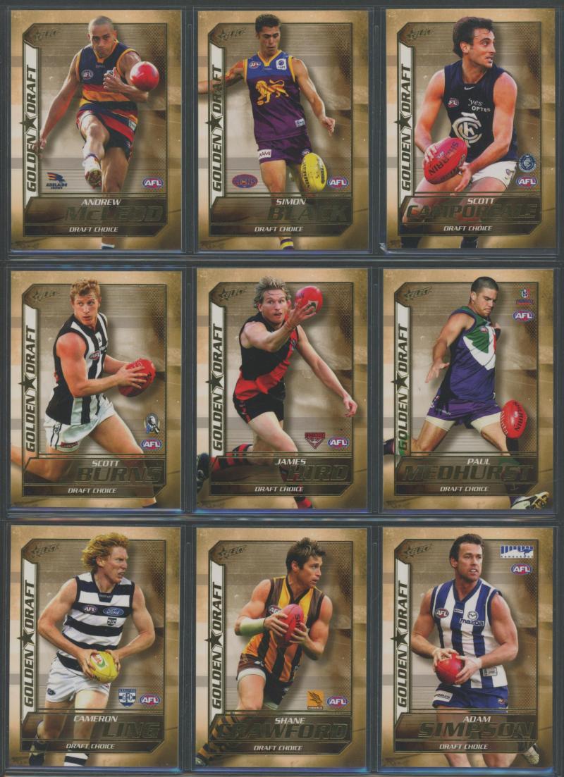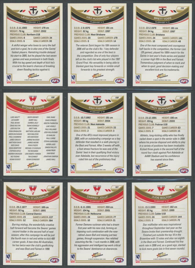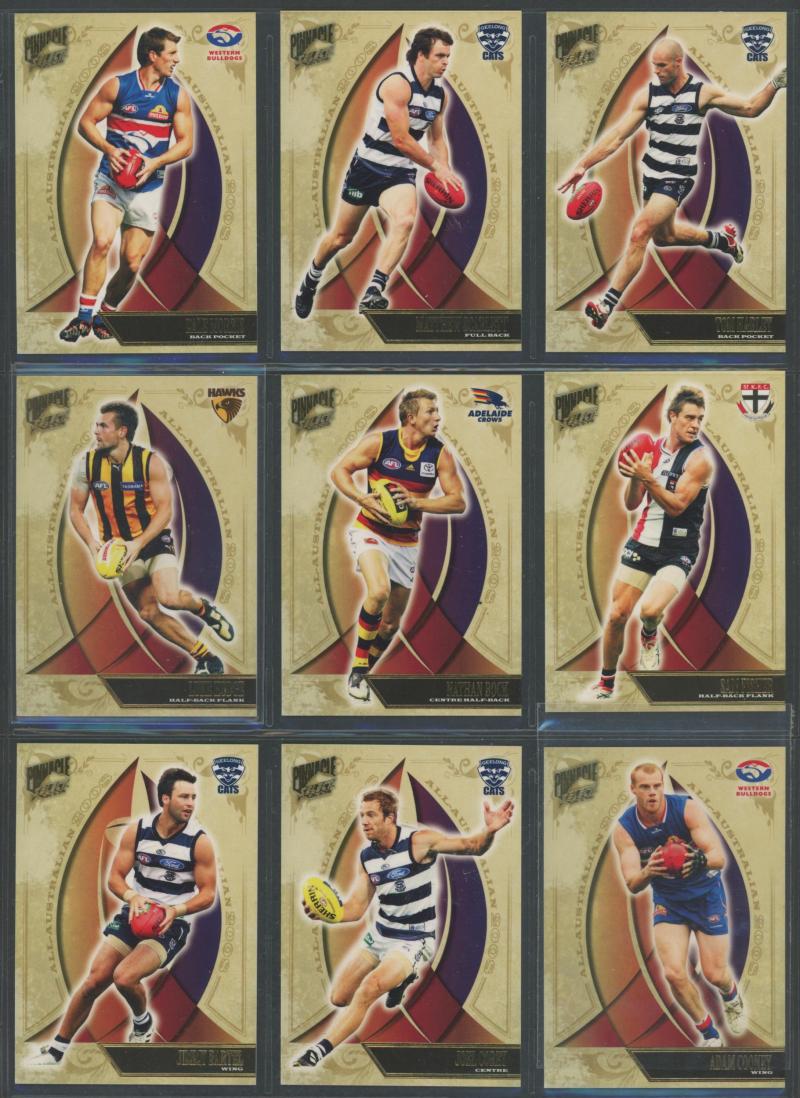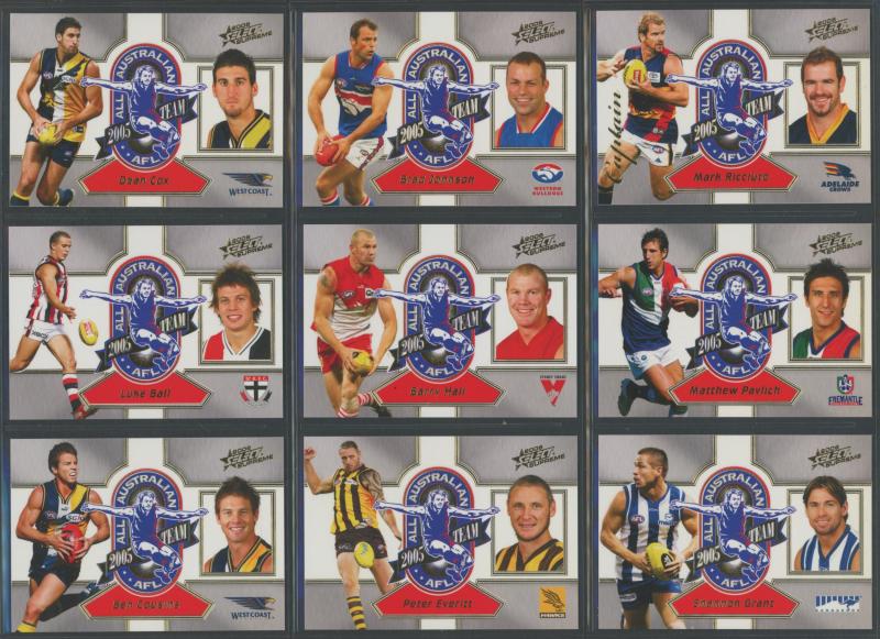 Captain Wild' [16]; 2005 Select 'All Australian' [22], 'Golden Draft' [16], 'Footy Face Die-Cuts' [195] & 'Footy Face Idols' [16]; 2006 Select 'All Australian' [22], 'Die-Cut Guernsey Cards' [96] & 'Lenticular New Generation' [20], mainly fine/Very