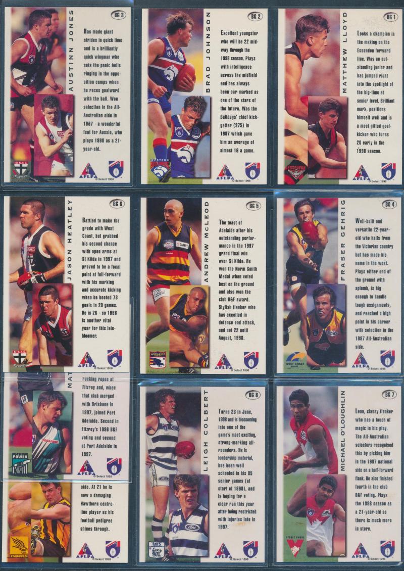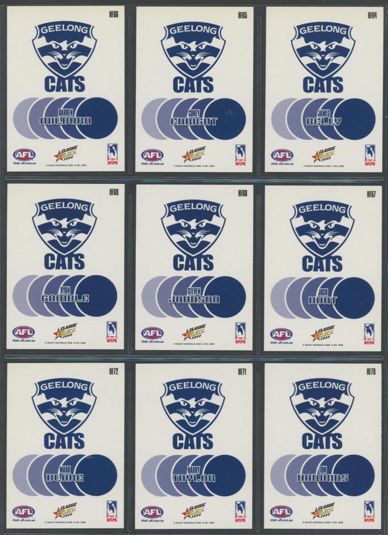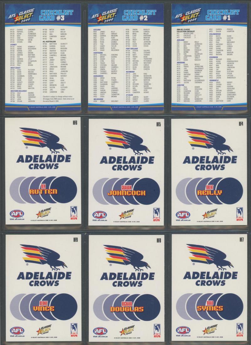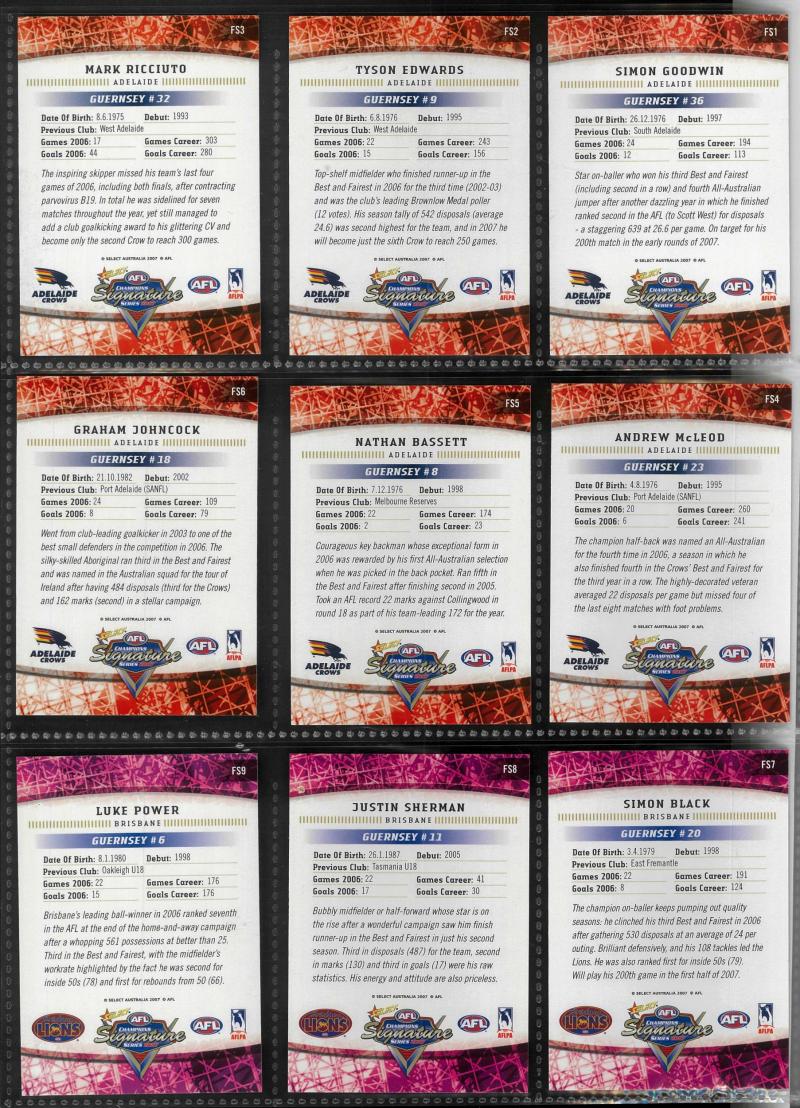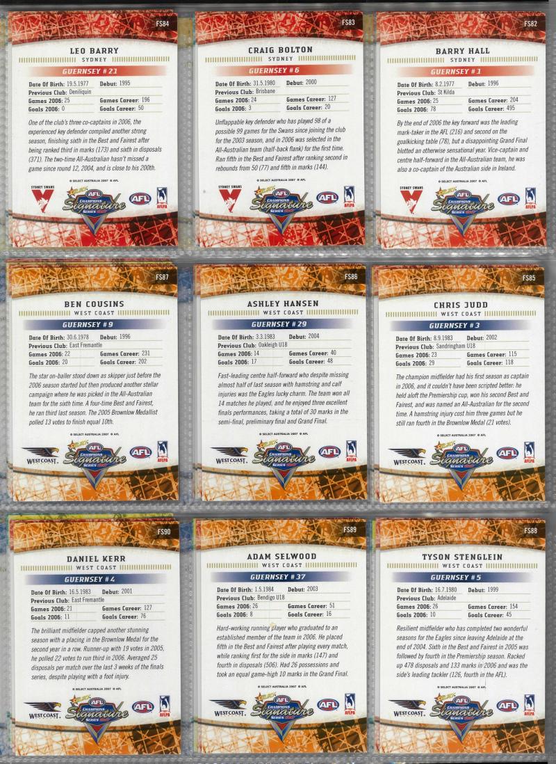 Captain Wild' [16]; 2005 Select 'All Australian' [22], 'Golden Draft' [16], 'Footy Face Die-Cuts' [195] & 'Footy Face Idols' [16]; 2006 Select 'All Australian' [22], 'Die-Cut Guernsey Cards' [96] & 'Lenticular New Generation' [20], mainly fine/Very