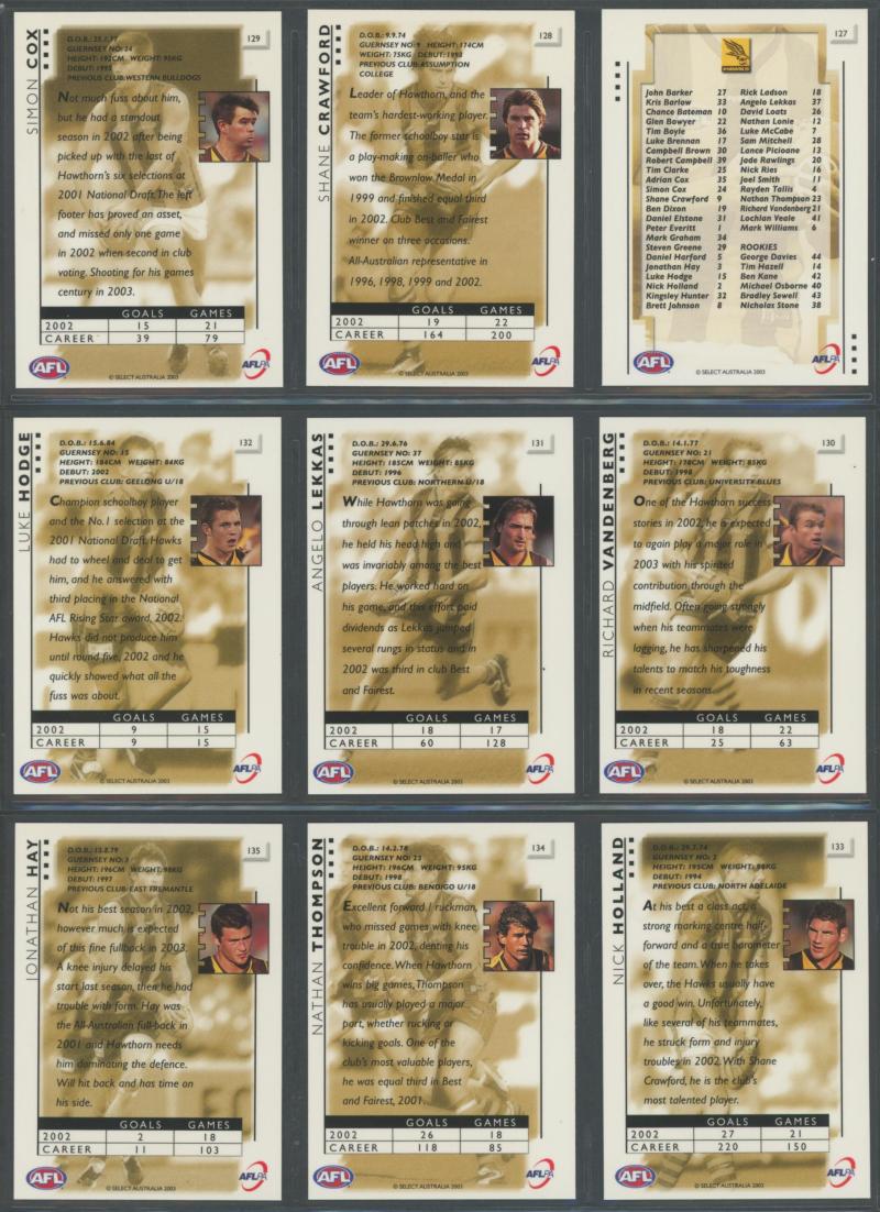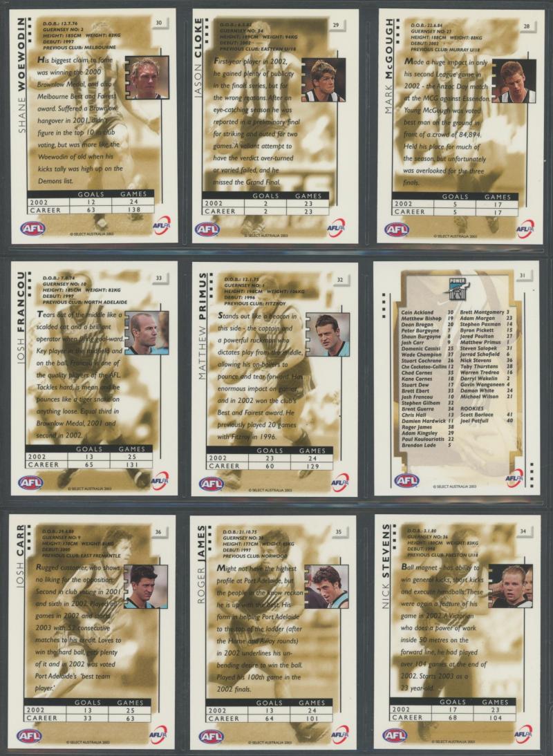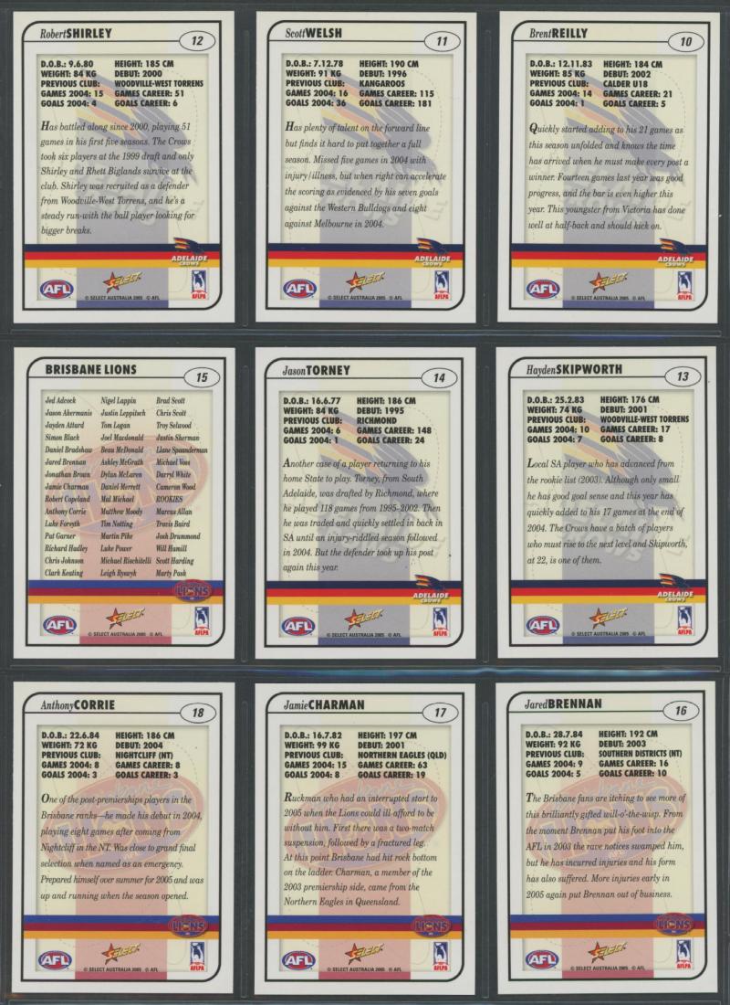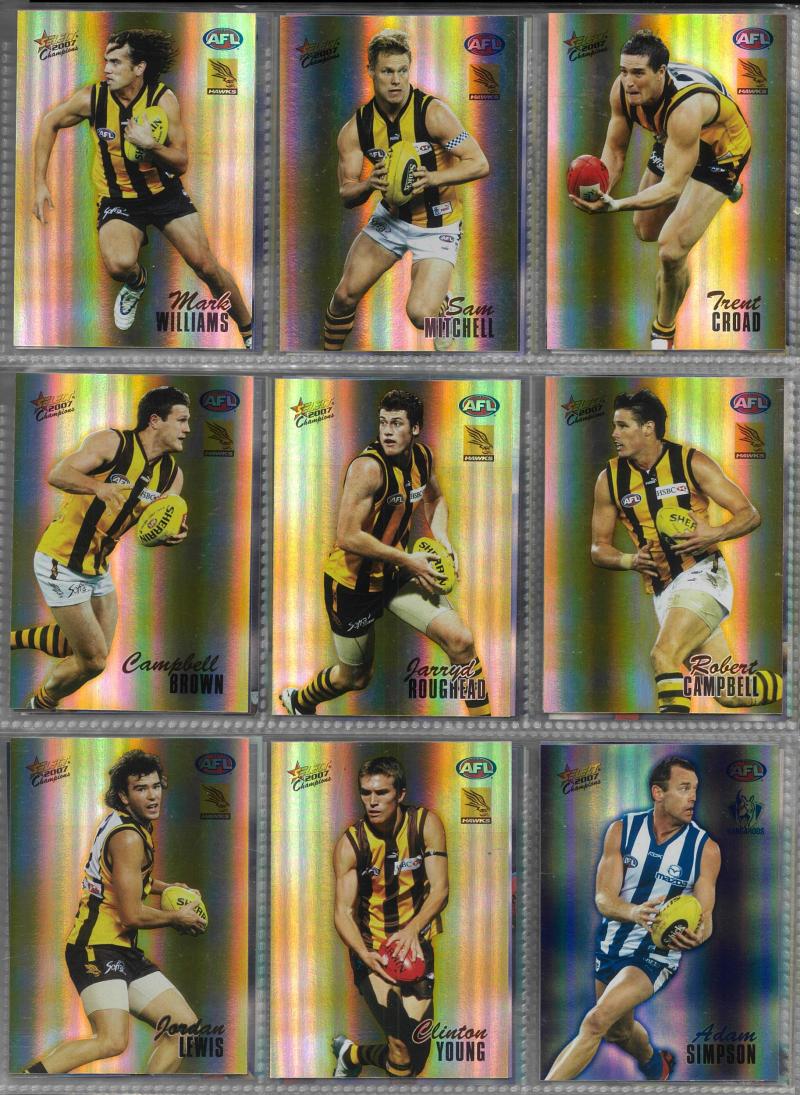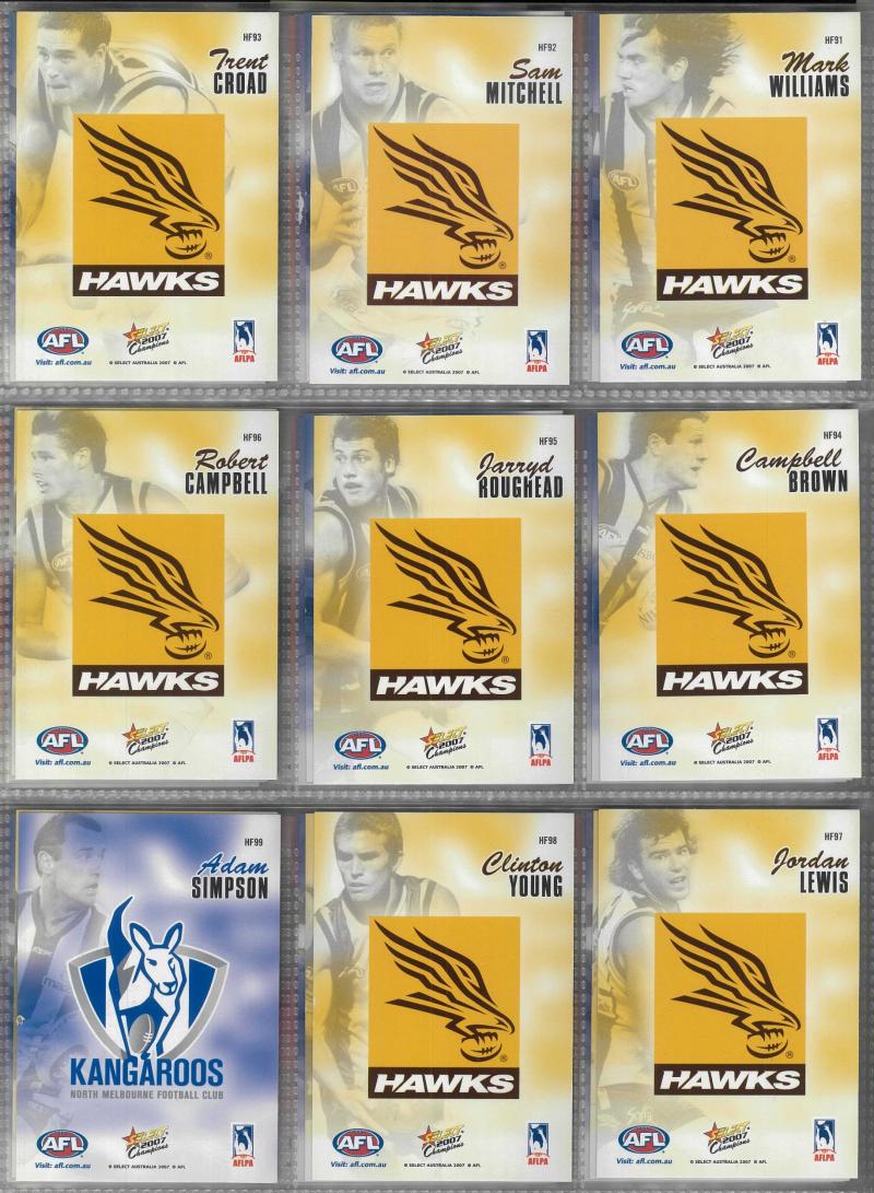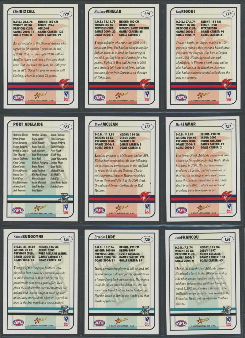 Captain Wild' [16]; 2005 Select 'All Australian' [22], 'Golden Draft' [16], 'Footy Face Die-Cuts' [195] & 'Footy Face Idols' [16]; 2006 Select 'All Australian' [22], 'Die-Cut Guernsey Cards' [96] & 'Lenticular New Generation' [20], mainly fine/Very