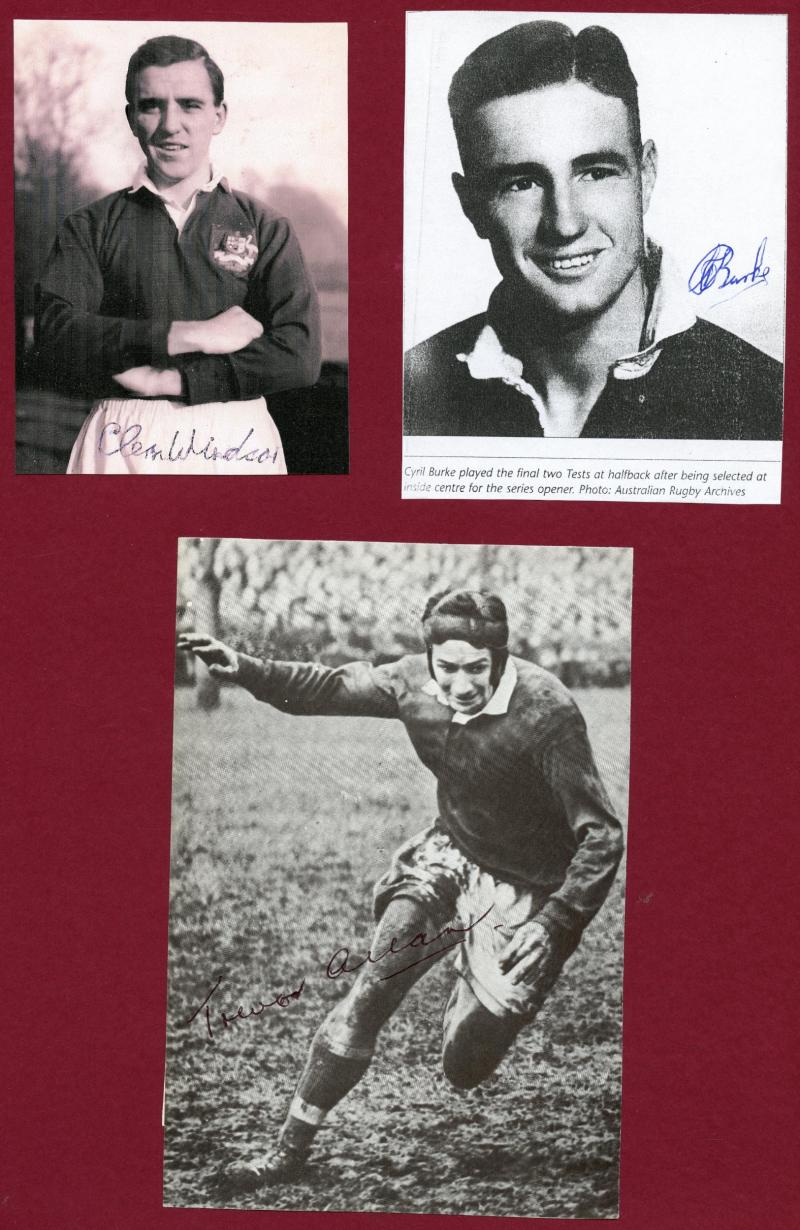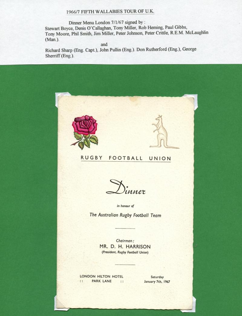 Premiers) with 18 signatures; 1947-48 Wallabies two autograph pages with 26 signatures; 1957-58 Wallabies team sheets (x2) each with 30 signatures; 1958 programme with 55 signatures; 1966-67 Wallabies dinner menu with 16 signatures; range of signed