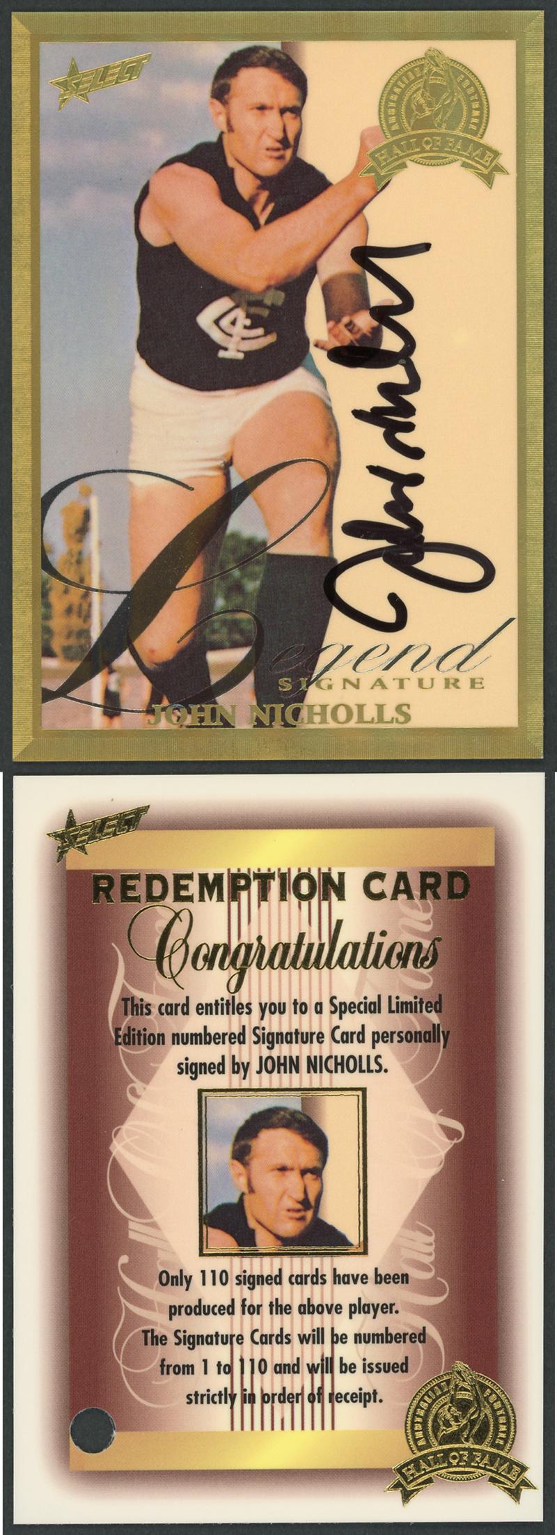 1996 Select 'Hall of Fame Legends Signature Card - John Nicholls' with Redemption Card, numbered 98 of 110, Very Fine. (Image1)