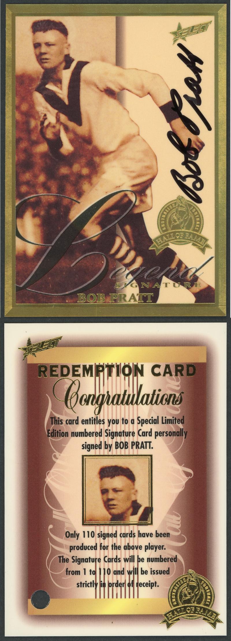 1996 Select 'Hall of Fame Legends Signature Card - Bob Pratt' with Redemption Card, numbered 98 of 110, Very Fine. (Image1)