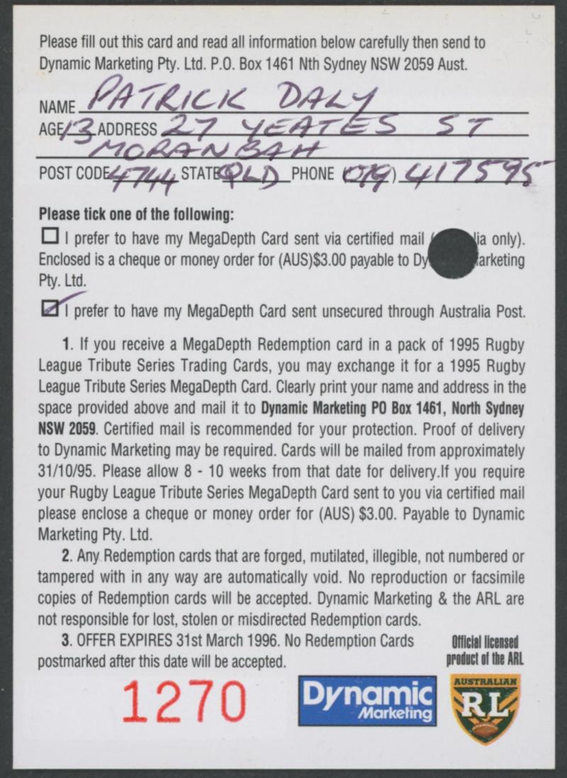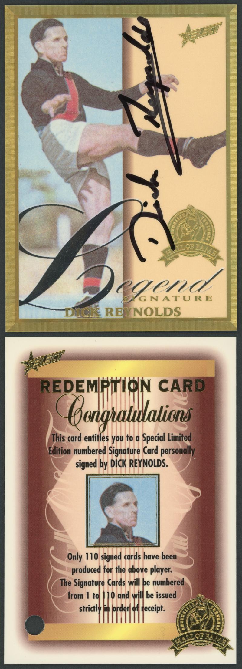 1996 Select 'Hall of Fame Legends Signature Card - Dick Reynolds' with Redemption Card, numbered 98 of 110, Very Fine. (Image1)