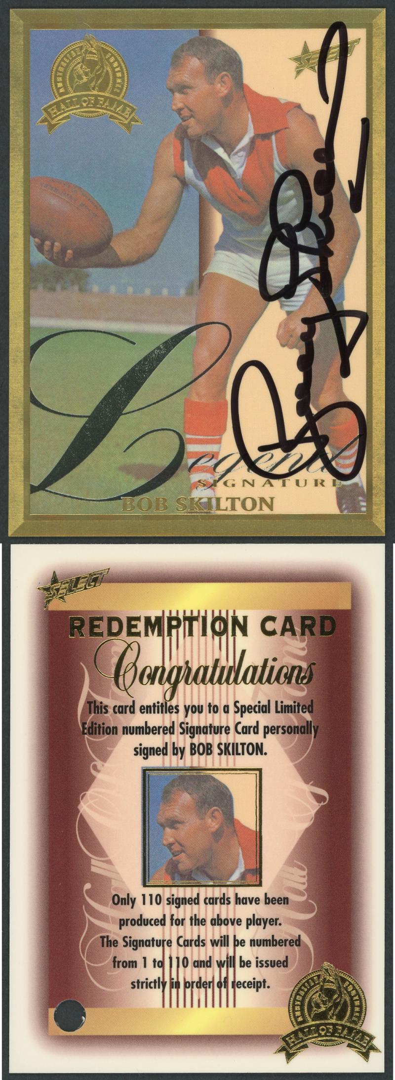 1996 Select 'Hall of Fame Legends Signature Card - Bob Skilton' with Redemption Card, numbered 98 of 110, Very Fine. (Image1)