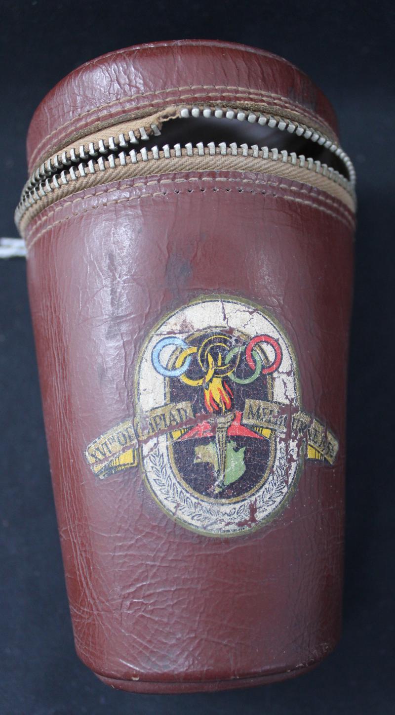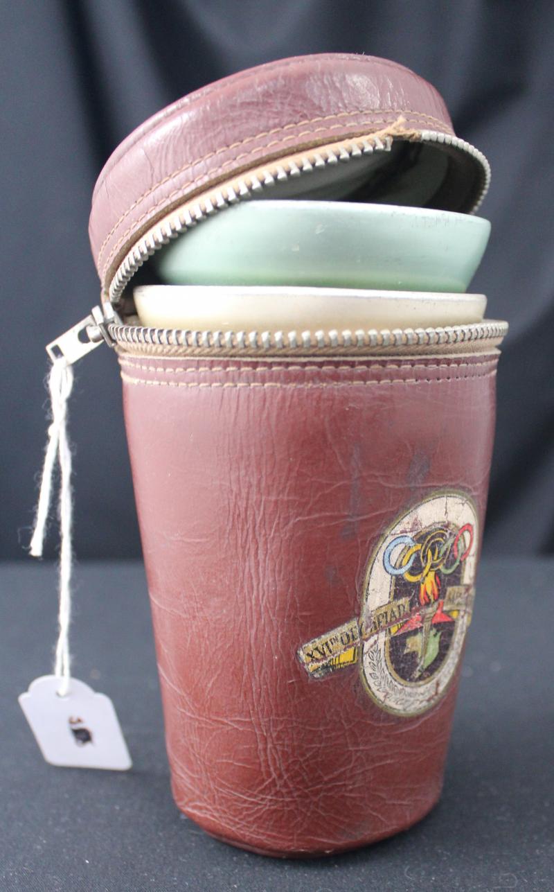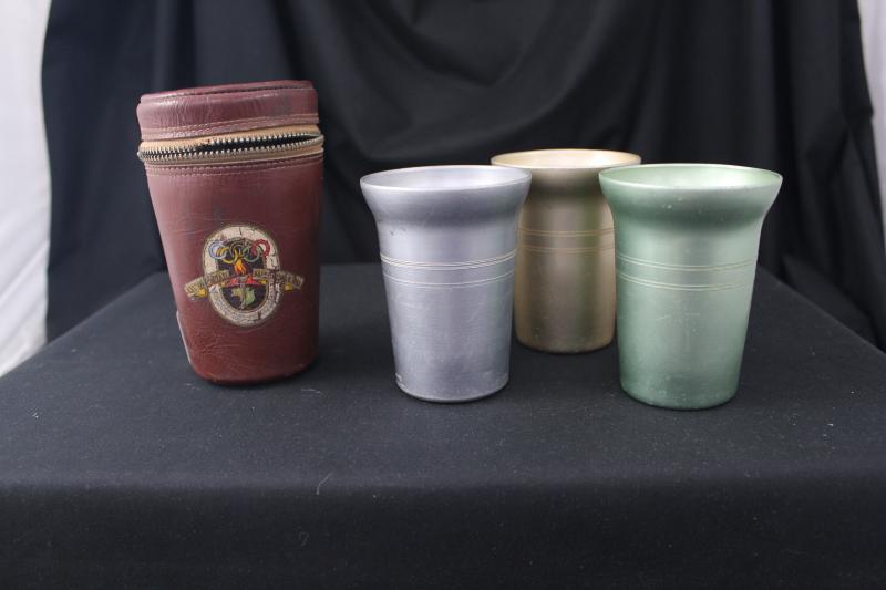 1956 Melbourne Olympics Drinking goblets set of three coloured aluminium drinking cups in lined leather case with logo, zip is