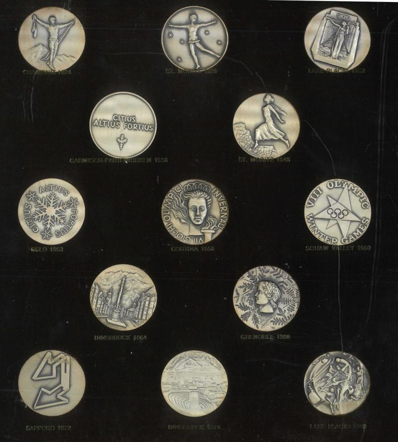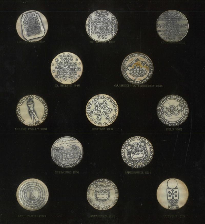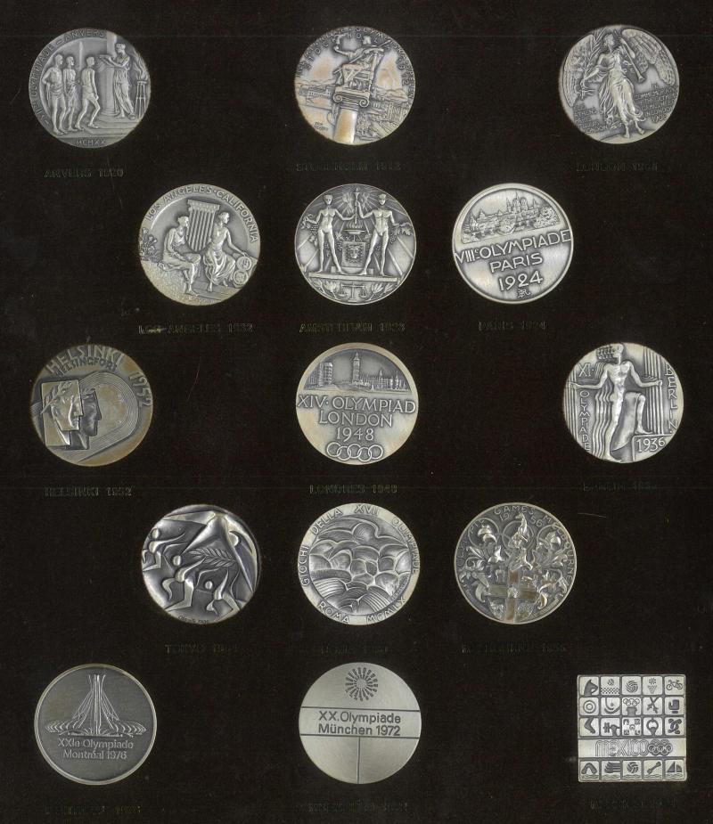 Participants commemorative medals 1920-1980 replicas (28) in two wall mounted displays (640mm x 345mm), flip-over frame so that