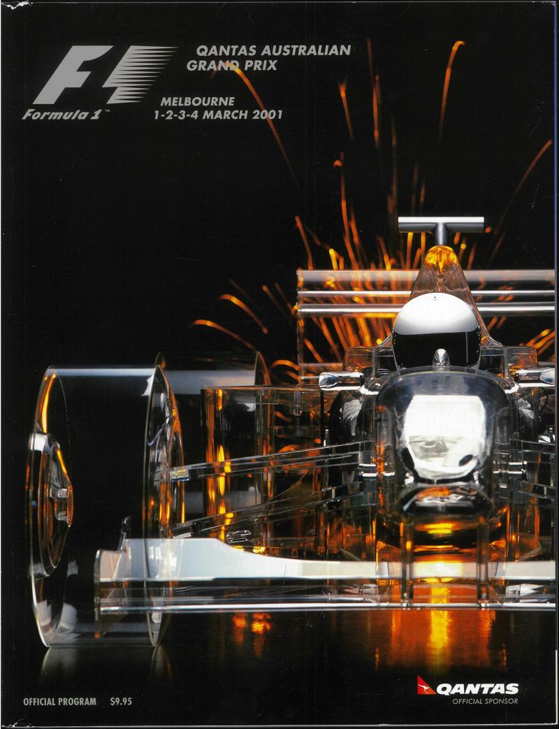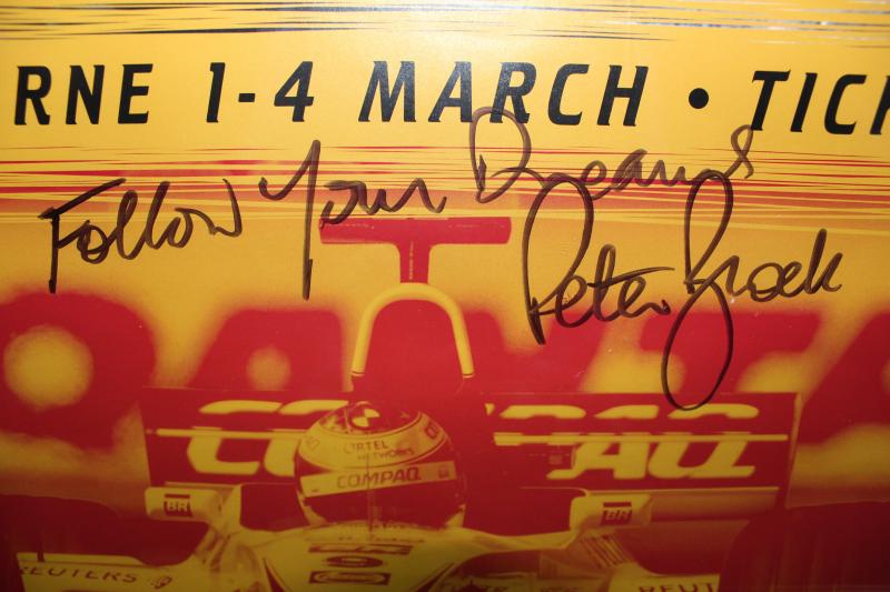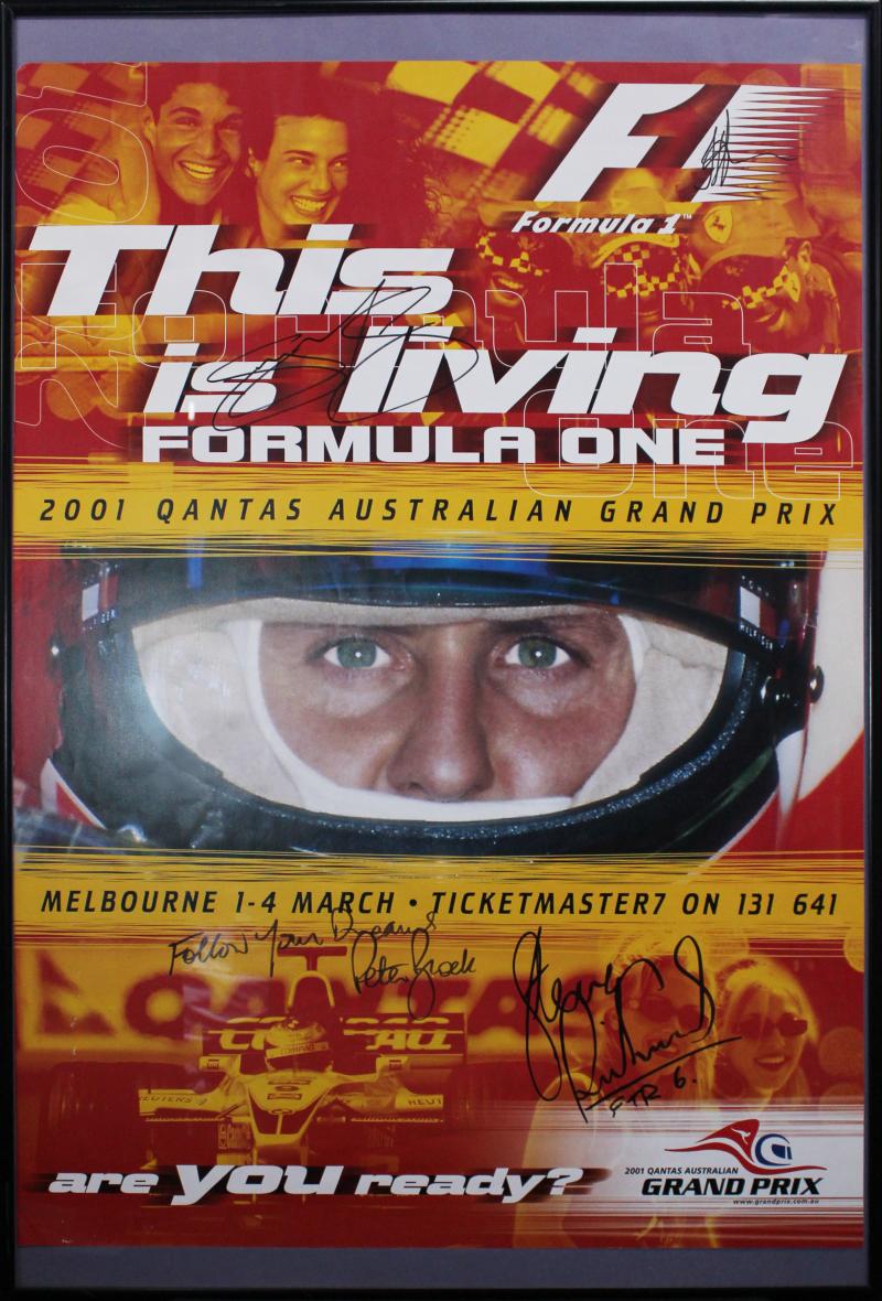 Poster 'This is Living, Formula One, 2001 QANTAS Australian Grand Prix, Melbourne, 1-4 March' with 4 signatures including Peter