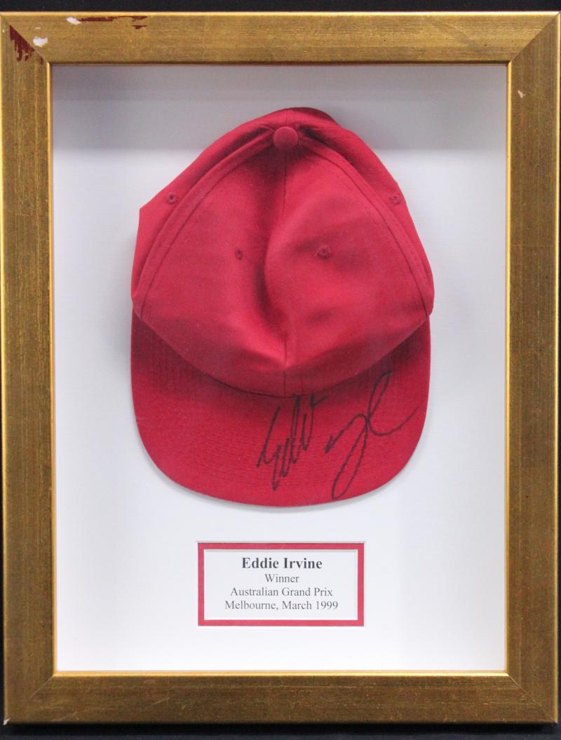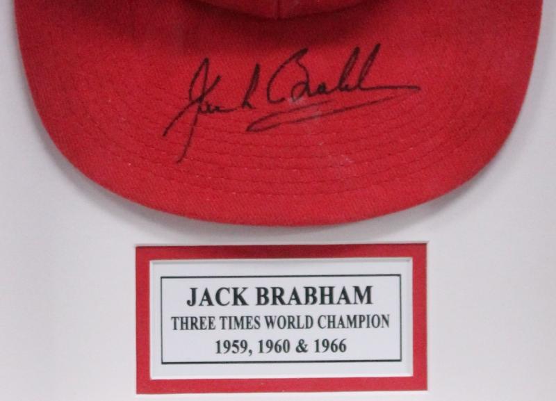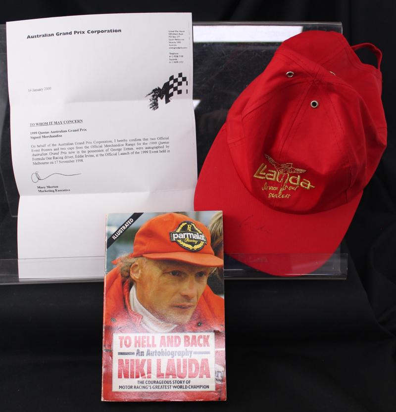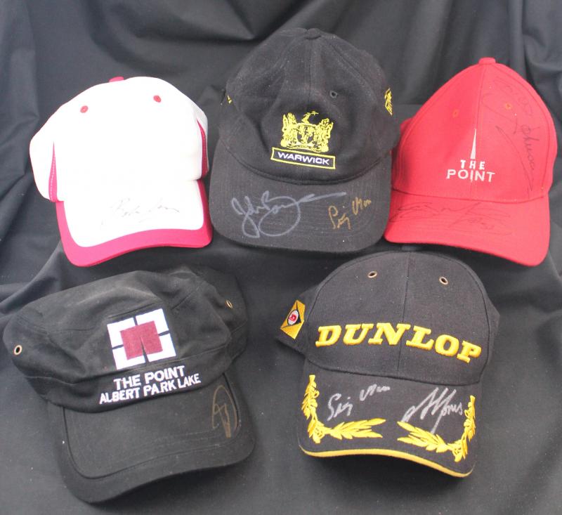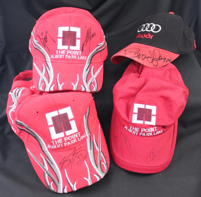 Signed caps Collection of caps (24) with 33 signatures including Jack Brabham, Eddie Irvine (these first two framed), Niki Lauda,