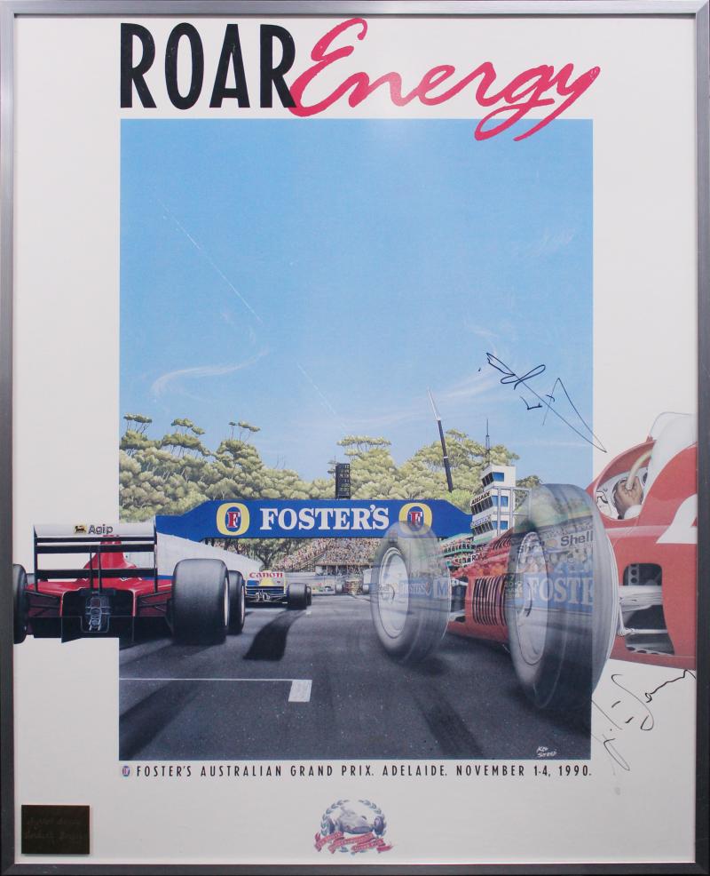 Poster 'ROAR Energy. Fosters Australian Grand Prix. Adelaide. November 1-4, 1990' signed by Ayrton Senna & Gerhard Berger, framed &