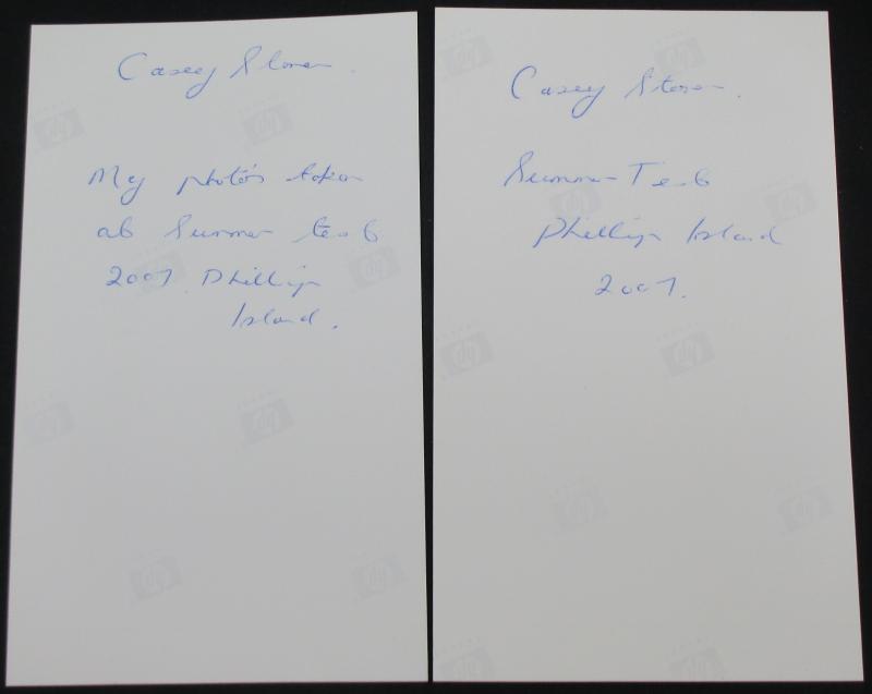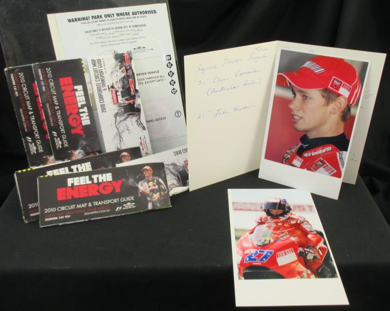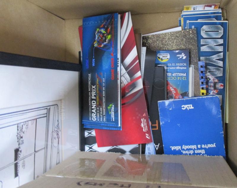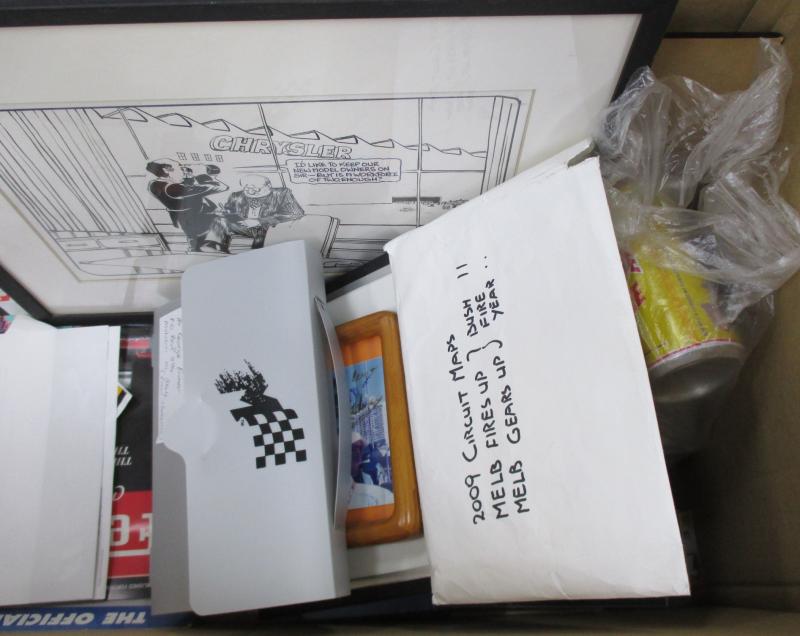 Up' (changed due to bushfires); signed photos Mark Weber, Dick Johnson (2), Chris Vermeulen (2), Will Power & Casey Stoner (2); original Pickering cartoon re demise of Chrysler; 1997 calendar; ephemera (35 items); various stickers (100); covers (27);