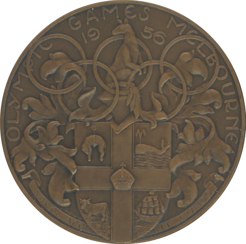 1956 Melbourne Olympics Participation Medal, in bronze, 63mm diameter, designed by Andor Meszaros, Olympic rings over Melbourne