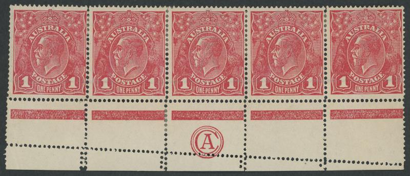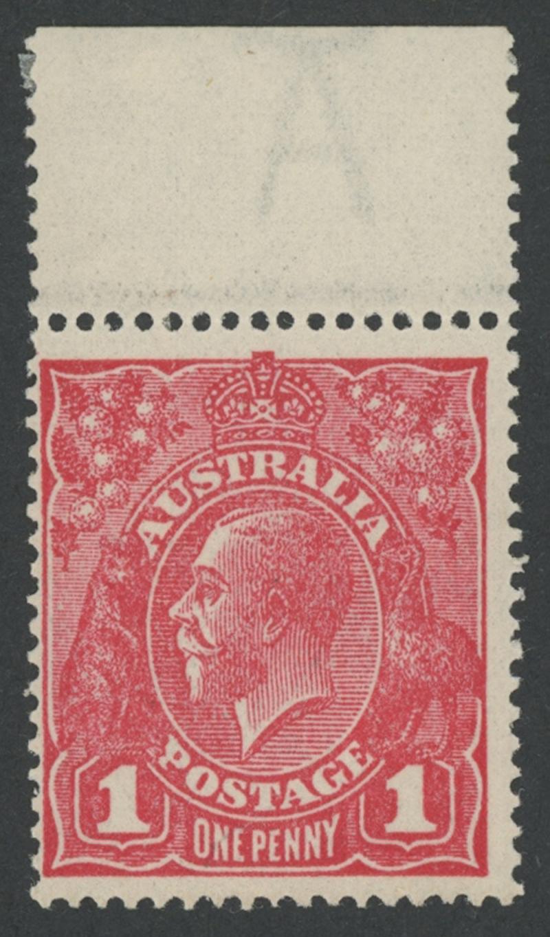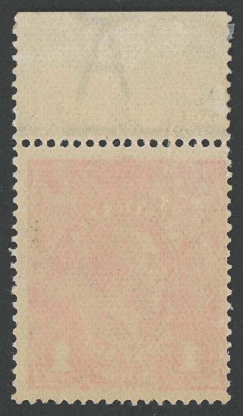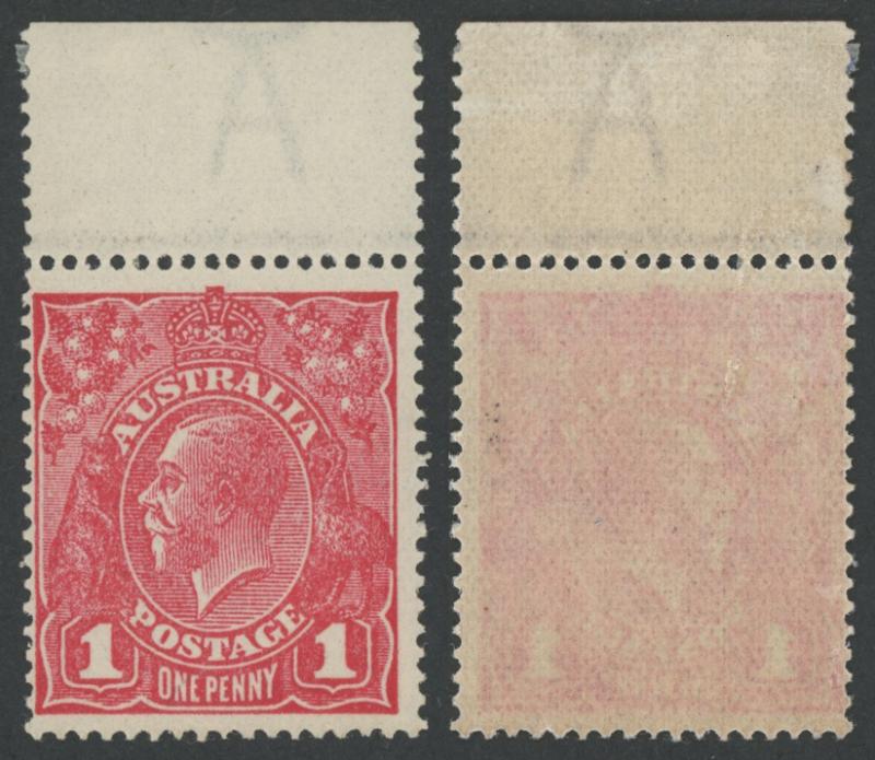1d carmine Rough Paper with No Watermark ACSC 72ab (SG 47k), marginal example from the top of the sheet with the 'A' & horizontal