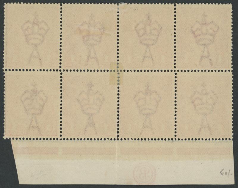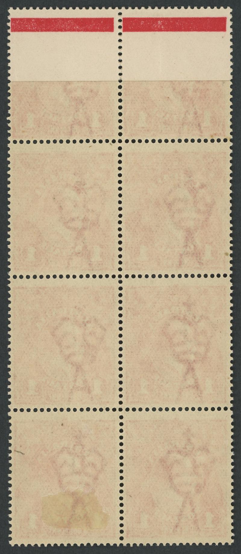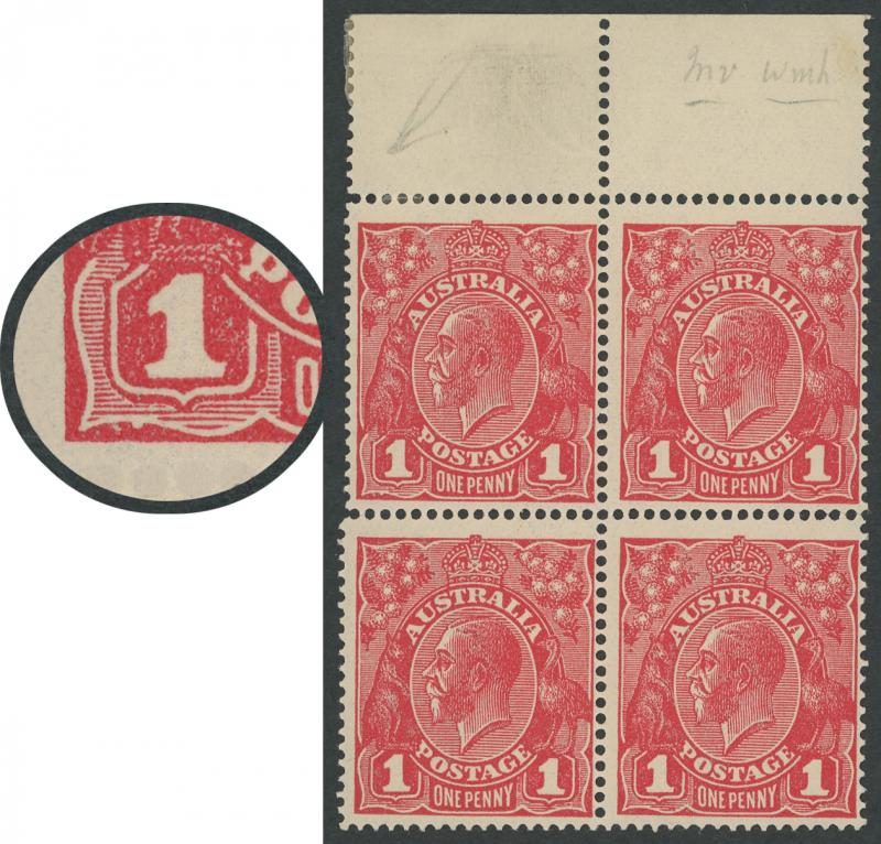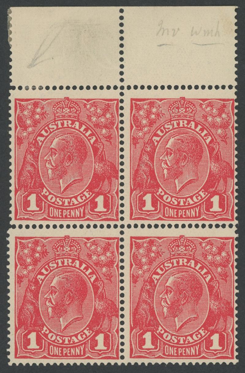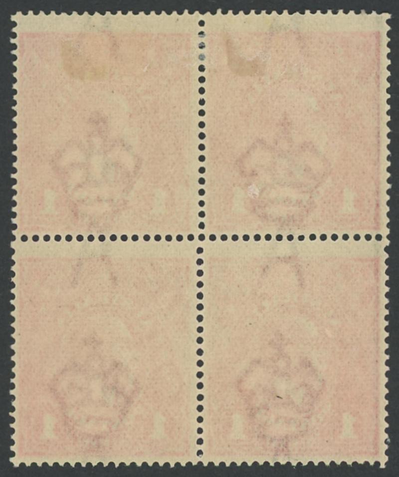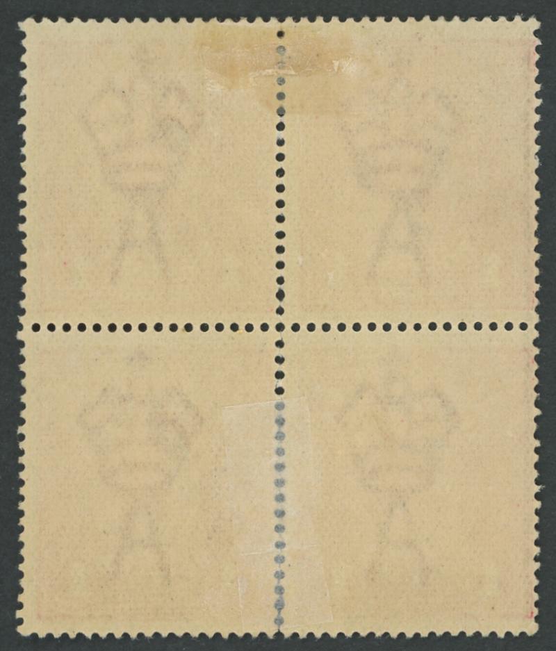1d red Die III with the Watermark Inverted ACSC 75a (SG 53w) marginal block of 4 from the top of the sheet, the upper-left unit