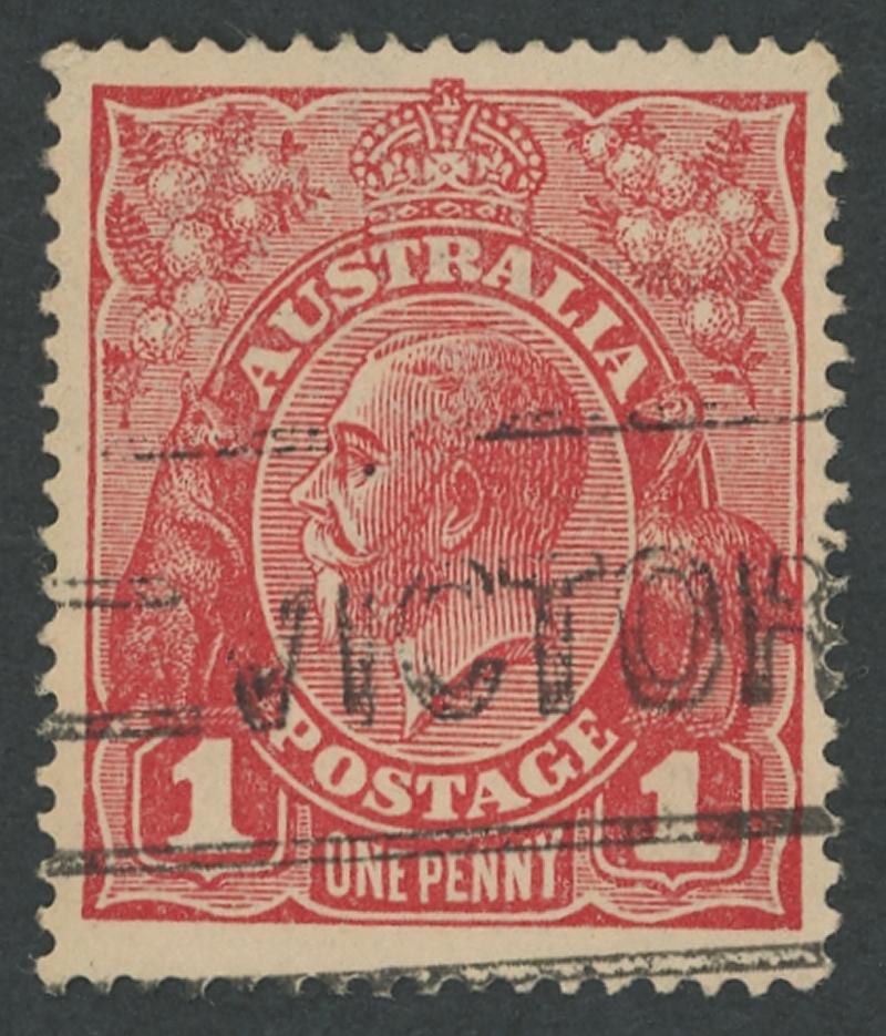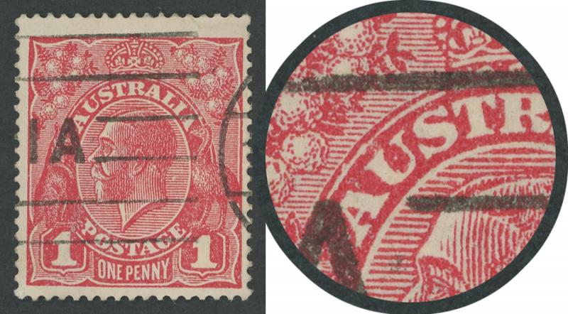 1d red Die III SG 53 with Thinned 'US' of 'AUSTRALIA' & White Flaw in 'U' (First State) [Pos 40] ACSC 75k, machine cancel clear of