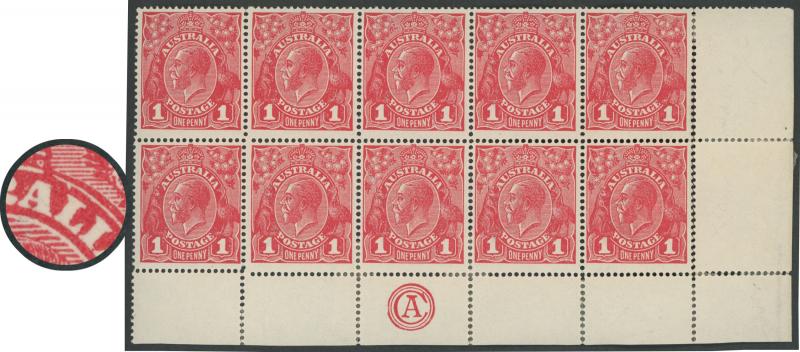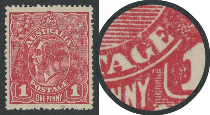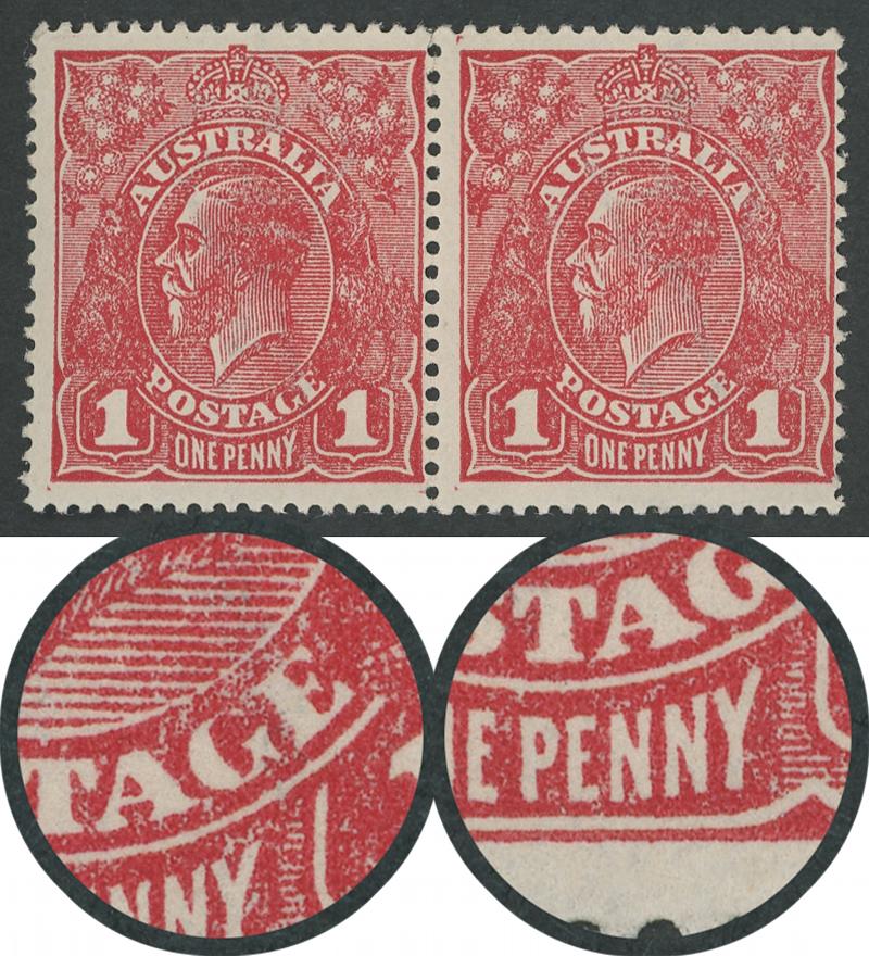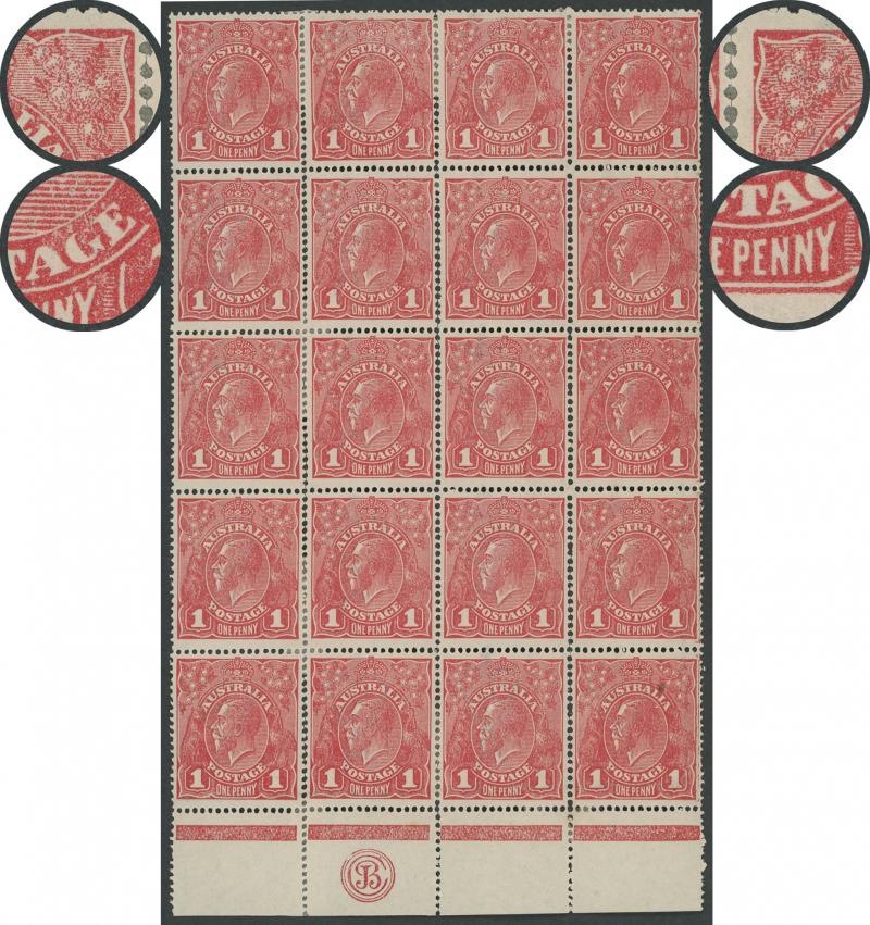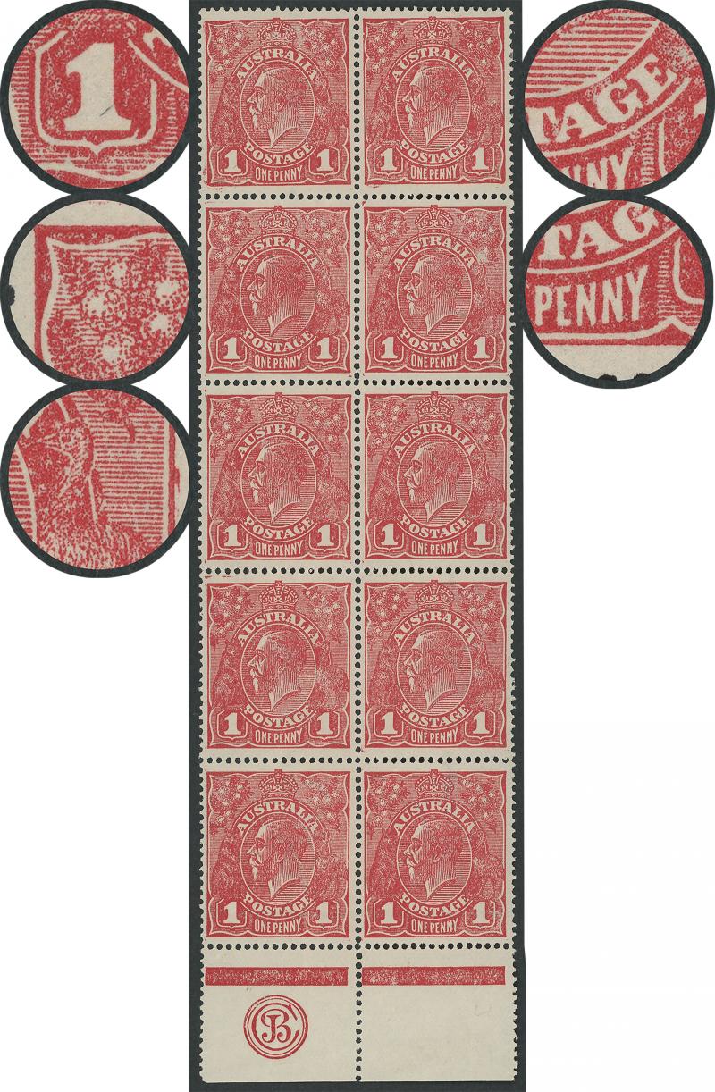 Clichés Die II / Die I [Pos IV/34-35] ACSC 72(2)ja & ka (SG 47ba & ia), Thin 'G' in 'POSTAGE' and Small Dot on 'Y' of 'PENNY' (Pregnant 'Y') [Pos IV/40-41], Colour Flaw outside Right Frame opposite Emu's Neck [Pos IV/46] plus 'JBC' Monogram [Pos