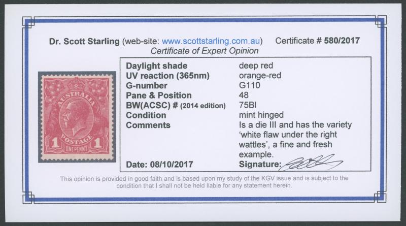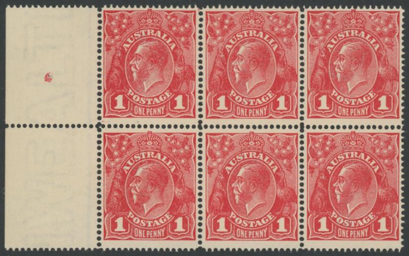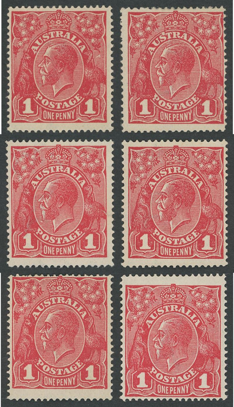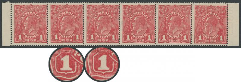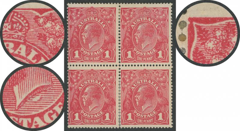 1d red Die III SG 53 listed varities comprising Scratch below Right Wattles [Pos 48], Flaw on 'S' of 'AUSTRALIA' [Pos 56], Flaw on