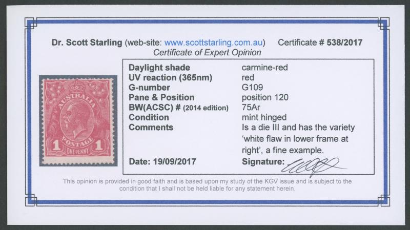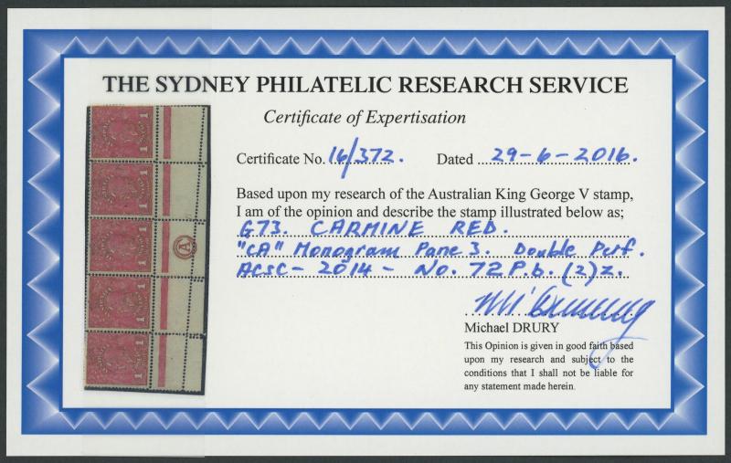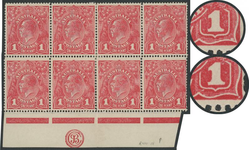 Flawed 'E' of 'POSTAGE' & White Flaw above 'L' of 'AUSTRALIA' [Pos 116] ACSC 75q but without White Flaw in Lower Frame at Right [Pos 120], extensive perf reinforcing mostly in the lower margin affecting the monogram unit and a couple of others, the