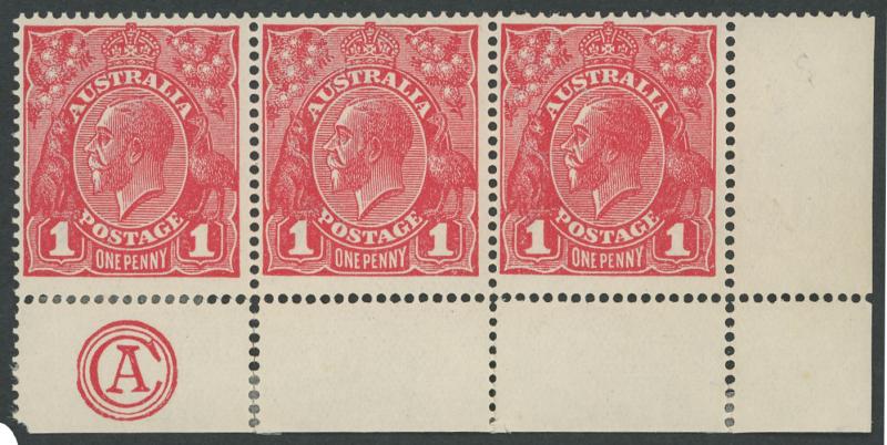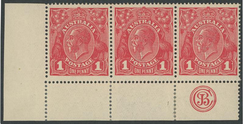 1d carmine-red G73 Rough Paper ACSC 72P (SG 47 shade variant) Plate 4 'JBC' Monogram strip of 3 with Run 'N' of 'One' (Second