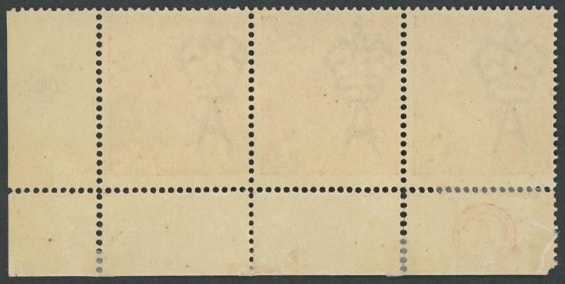 1d deep-red (aniline) Rough Paper Comb Perf SG 47a 'CA' Monogram left corner strip of 3 ACSC 72(4)z in a block of 6 (3x2), a couple