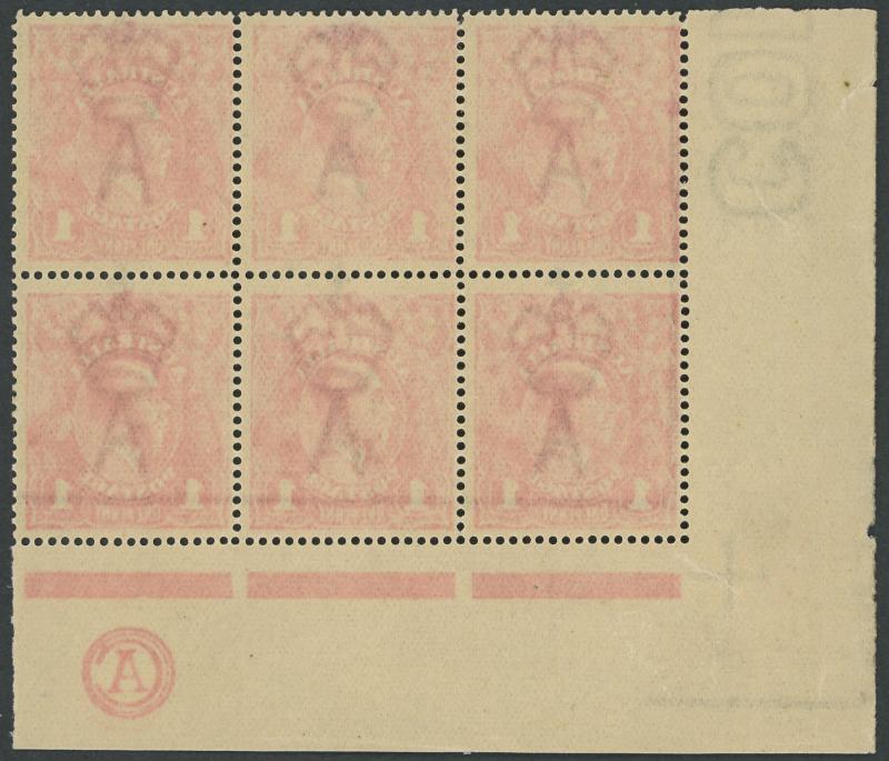 in footnote 5 that "mint blocks including both Substituted Clichés are rare ... most of the surviving blocks are in the rosine shade and punctured OS". Ex Arthur Gray - sold at our auction of 30.10.2015 for $6545 (Sale 207 Lot 119) - and Graeme
