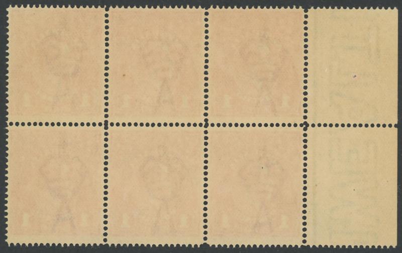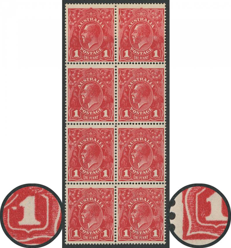 1d deep red (aniline) G61 Rough Paper ACSC 72P (SG 47a) Plate 2 block of 8 (2x4), the lower two units with Dot before '1' at Right