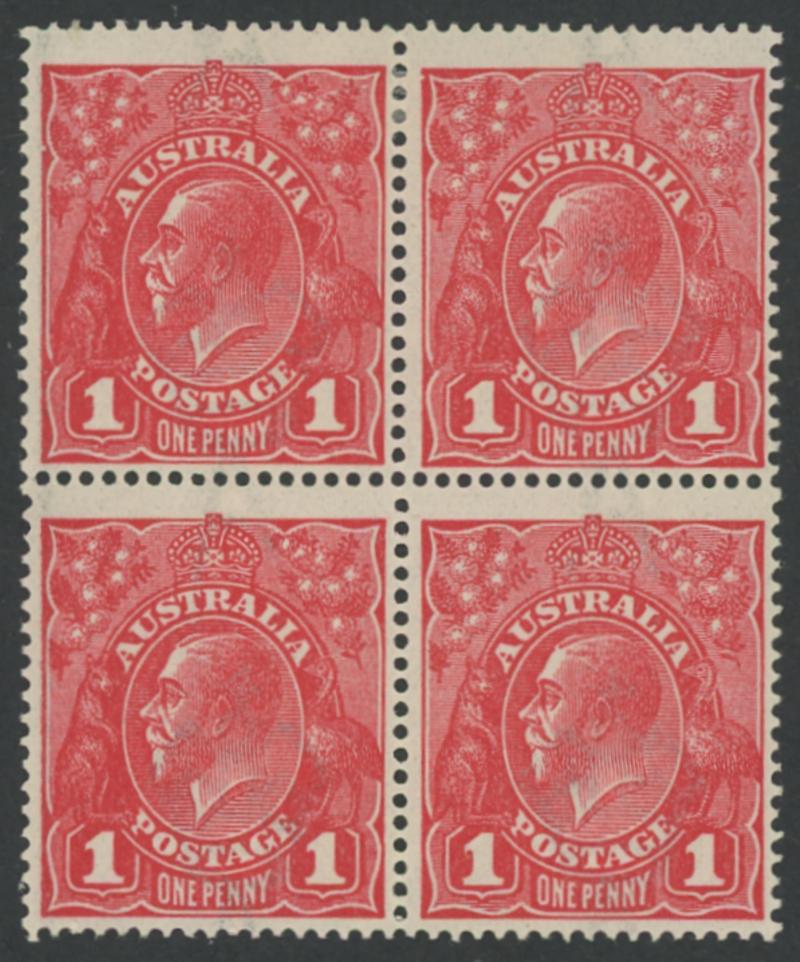 1d carmine-rose G74 Rough Paper ACSC 72Q (SG 47 shade variant) Plate 4 block of 4 the upper units with Wattle Line and Nick near