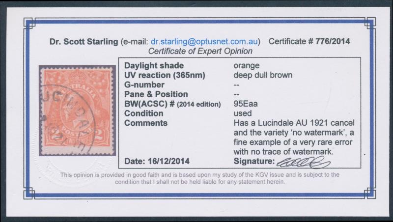 Scott Starling Certificate (2014) states "a very rare error with no trace of watermark". Absent from the Arthur Gray & Stuart Hardy collections. Ex Gerald Fon. (Image1) (Image2)