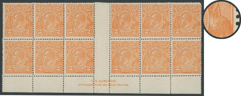 2d orange SG 62 Electro 3 TS Harrison Imprint (5¼mm below Stamps) block of 4 with Notch in Right Frame Behind Emu Pos [3R49] ACSC