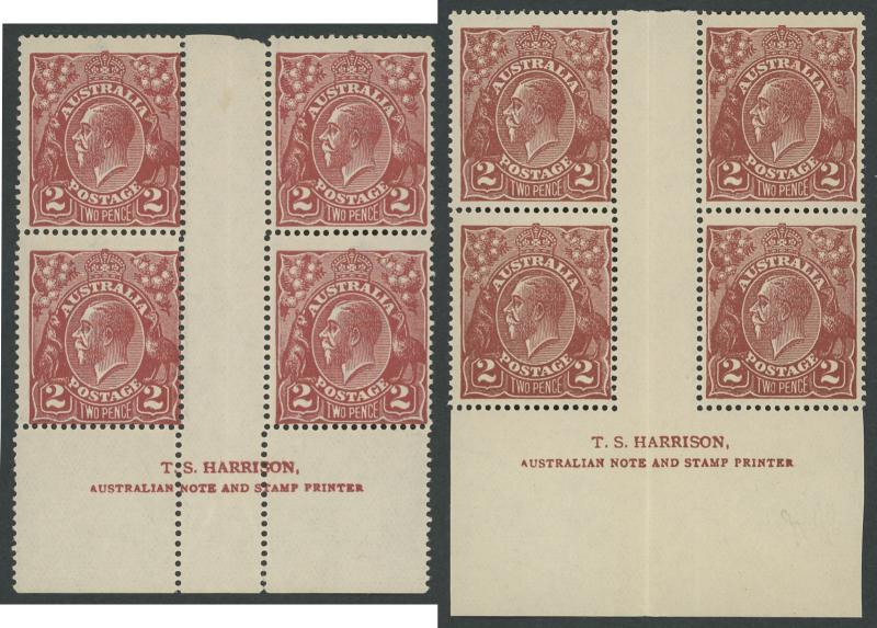 Position; Margin not Perforated) blocks of 4 ACSC 97(12)z & 97(16)z, the former lightly mounted in the gutter just touching the upper-right unit otherwise unmounted, the latter unmounted, Cat $1500+ for mounted. Ex Arthur Gray - sold at our auction