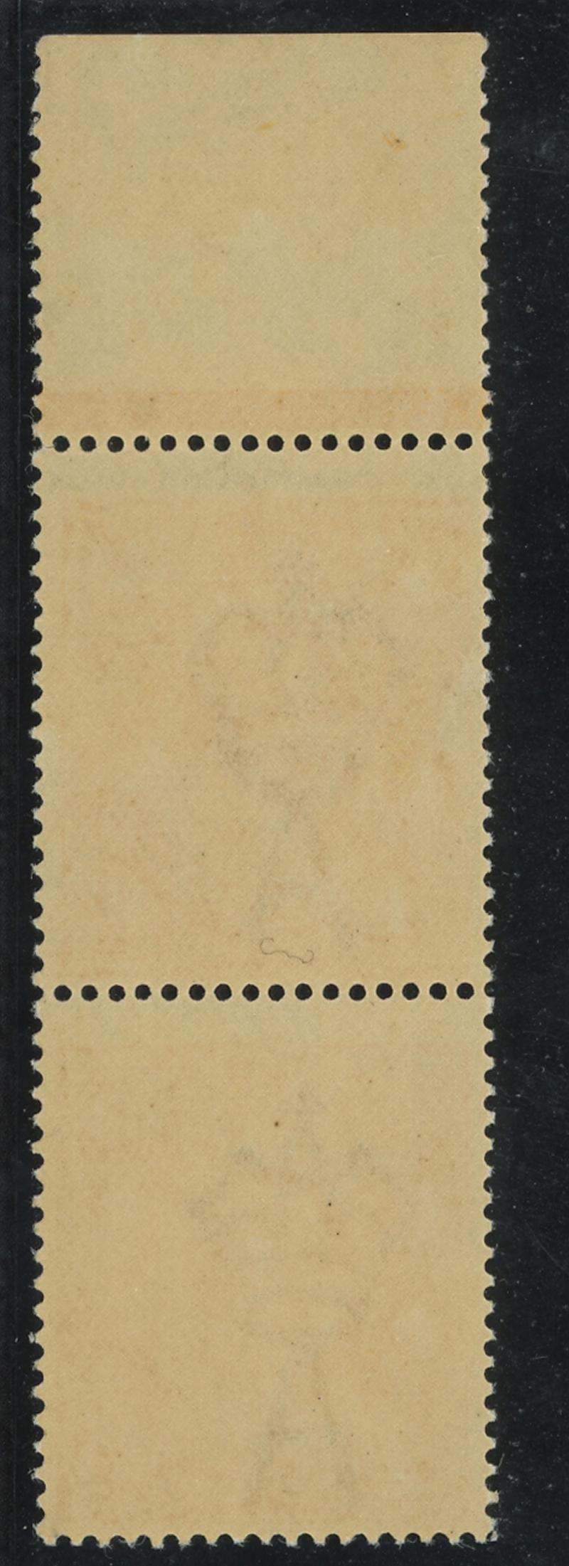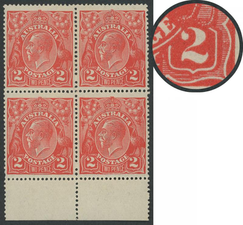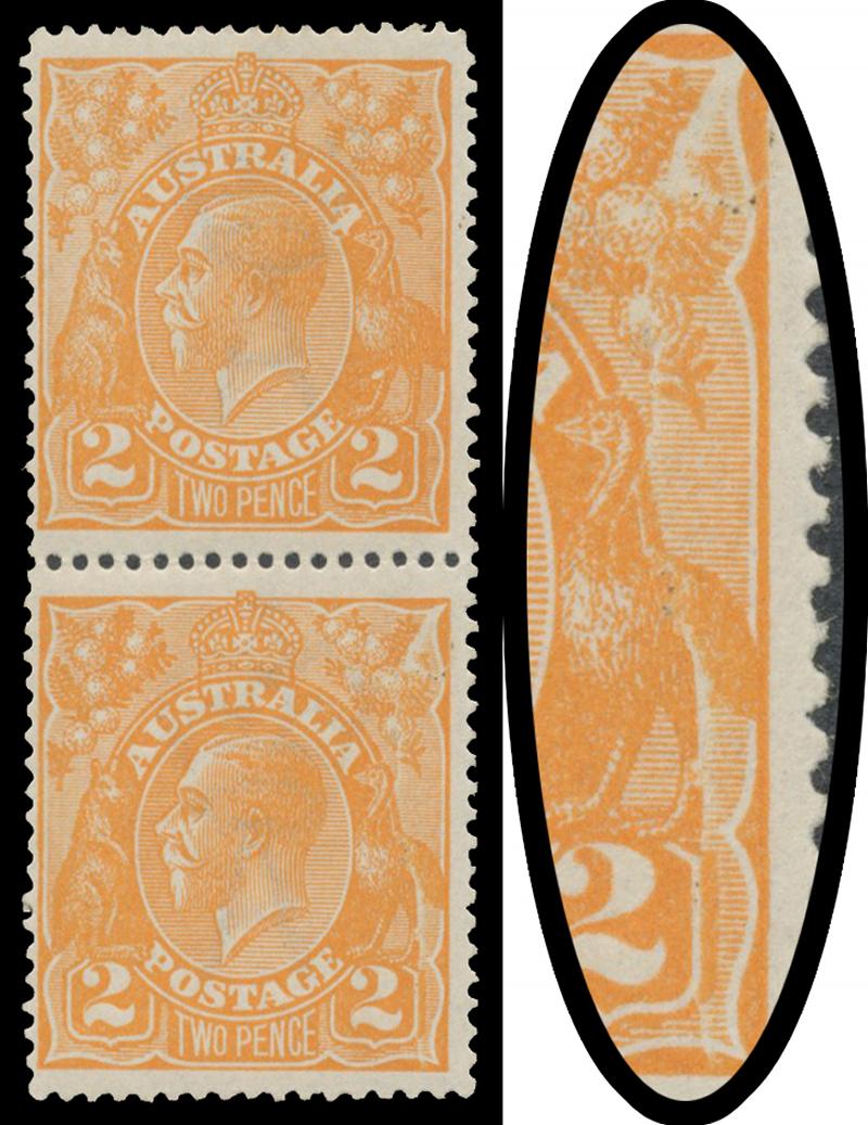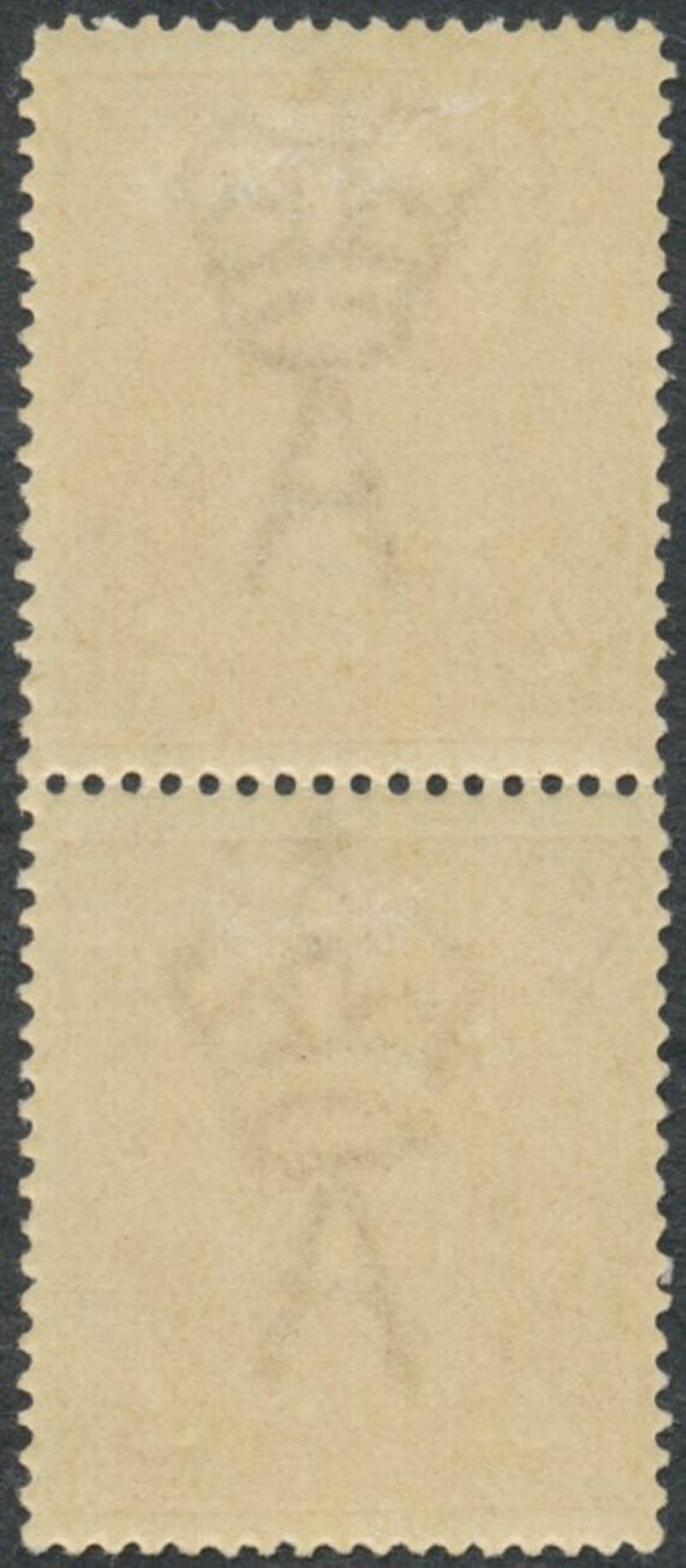 Base [Pos 1R27] ACSC 95(1)k, the upper unit with White Flaw on Last 'A' of 'AUSTRALIA' [Pos 1R21] ACSC 95(1)i, both units lightly mounted, Cat $1050+ for singles. One of the longest single-unit cracks in the entire KGV Series. Ex Arthur Gray - sold