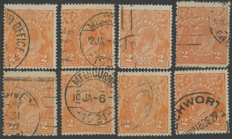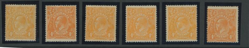 4d orange SG 22 listed varieties comprising Splintered Lower-Left Corner [Pos 1L58] (aged), Weeping '4' at Right [Pos 2L18], White