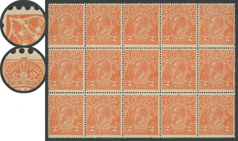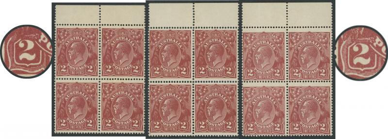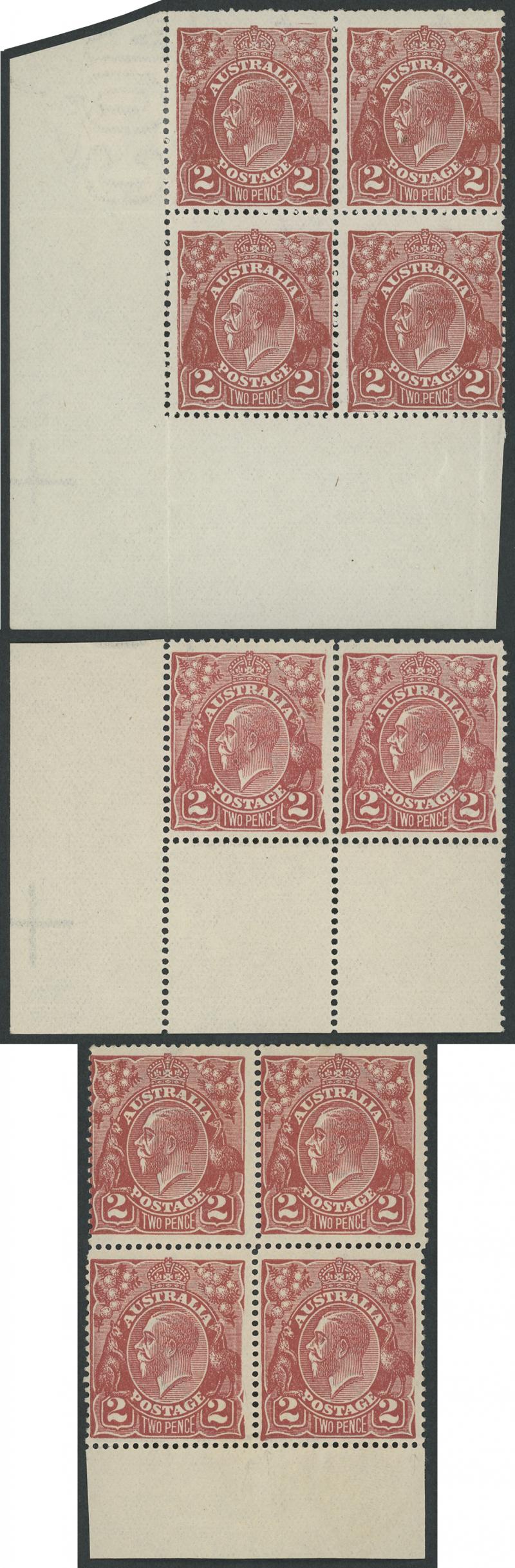 hinge remainders, Cat $2075+ for singles. The ACSC states that the White Kangaroo variety "was short-lived and later corrected, possibly by makeready". Scarce piece containing the three major varieties from this electro. Ex Gerald Fon. (Image1) (Image2)