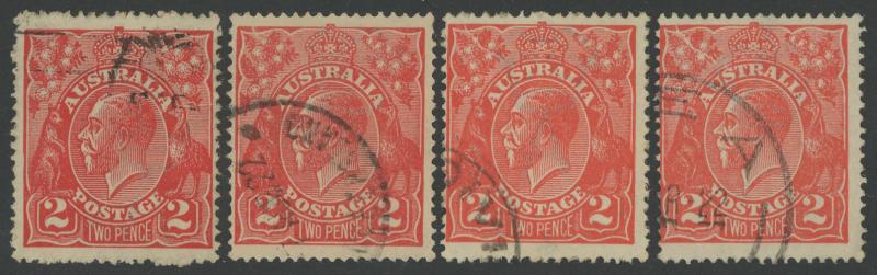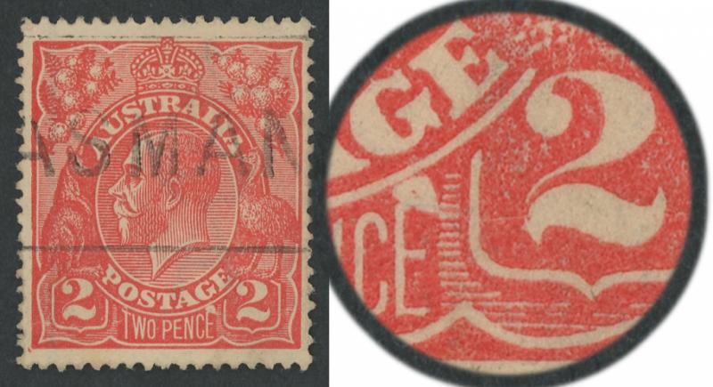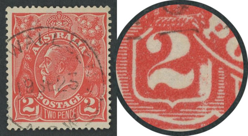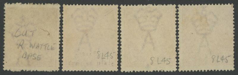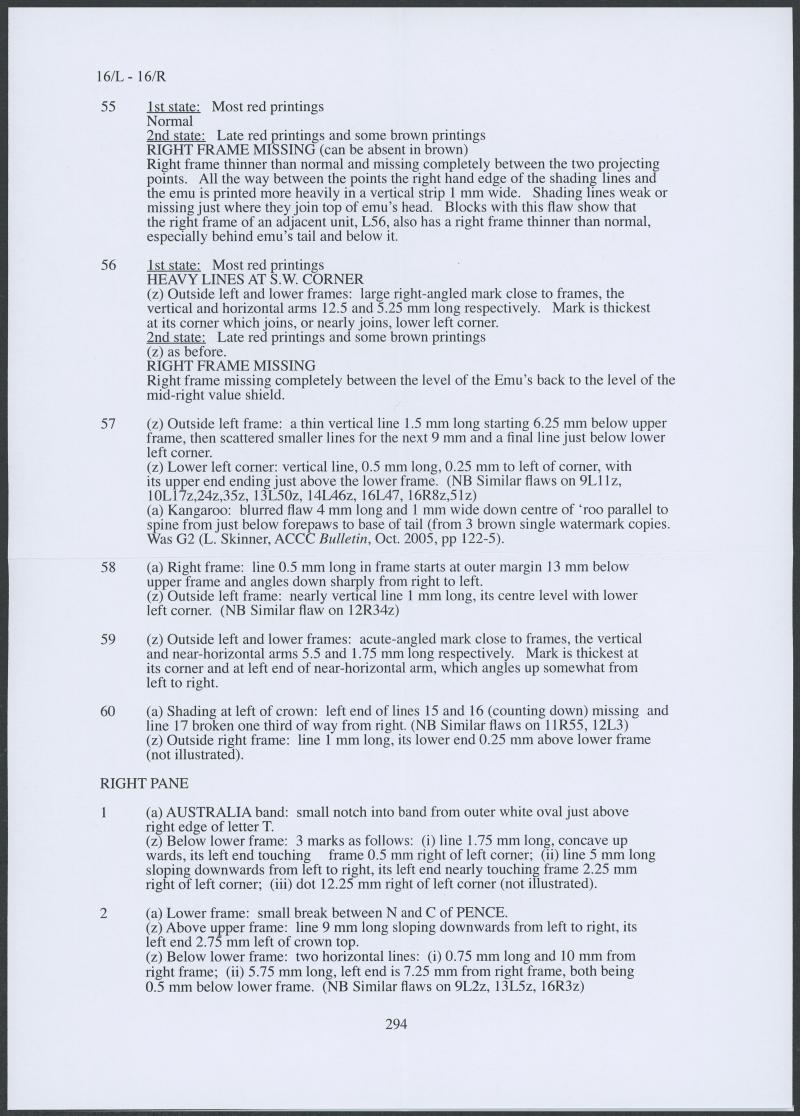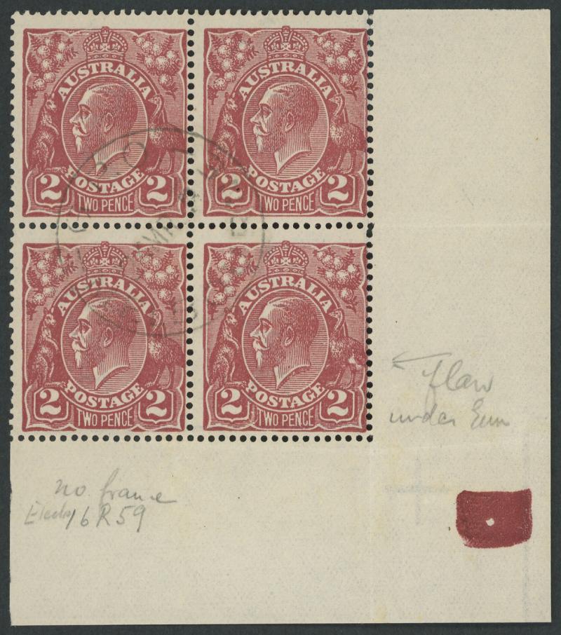 Scratch behind Emu [Pos 2R29] and Break in Upper Frame & Dot over 'FO' or 'FOUR' [Pos 2R58] ACSC 110(1)k and 110(2)f, v & ve, plus unlisted White Spot on Kangaroo's Ear, Break in Right Frame opposite Lowest Wattle, Long 'R' in 'FOUR', and a vertical