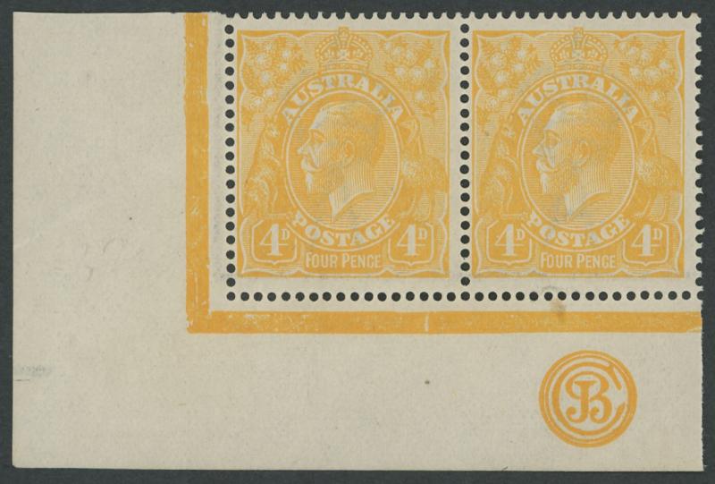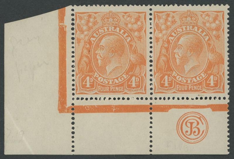 4d pale orange-yellow SG 22c Plate 2 'JBC' Monogram left corner pair with White Spot on Left '4' [Pos 2L56; the monogram unit] ACSC