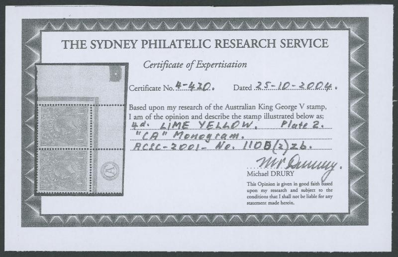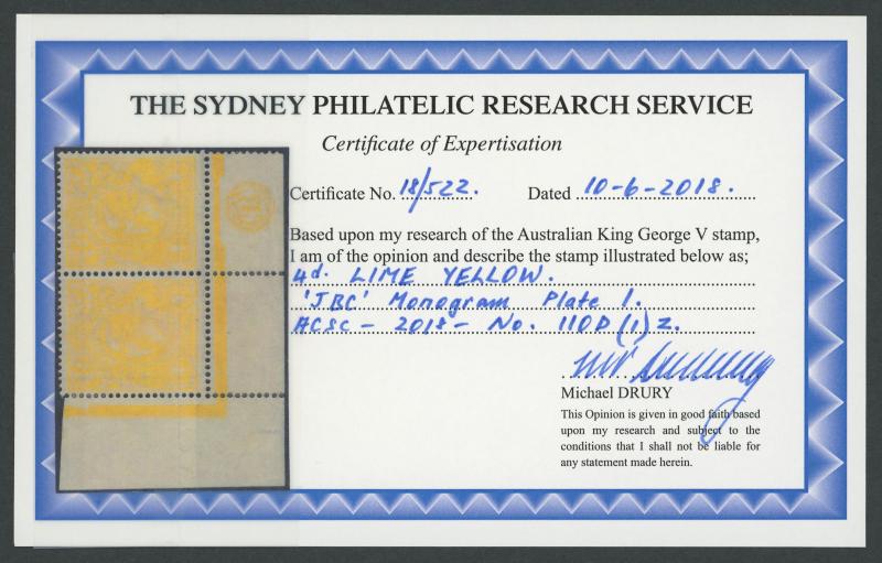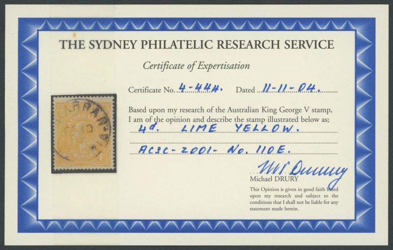 4d lime-yellow ACSC 110D (SG 22b shade variant), mostly light Prahran (Vic) 1916 cds cancel, Cat $500. Michael Drury Certificate