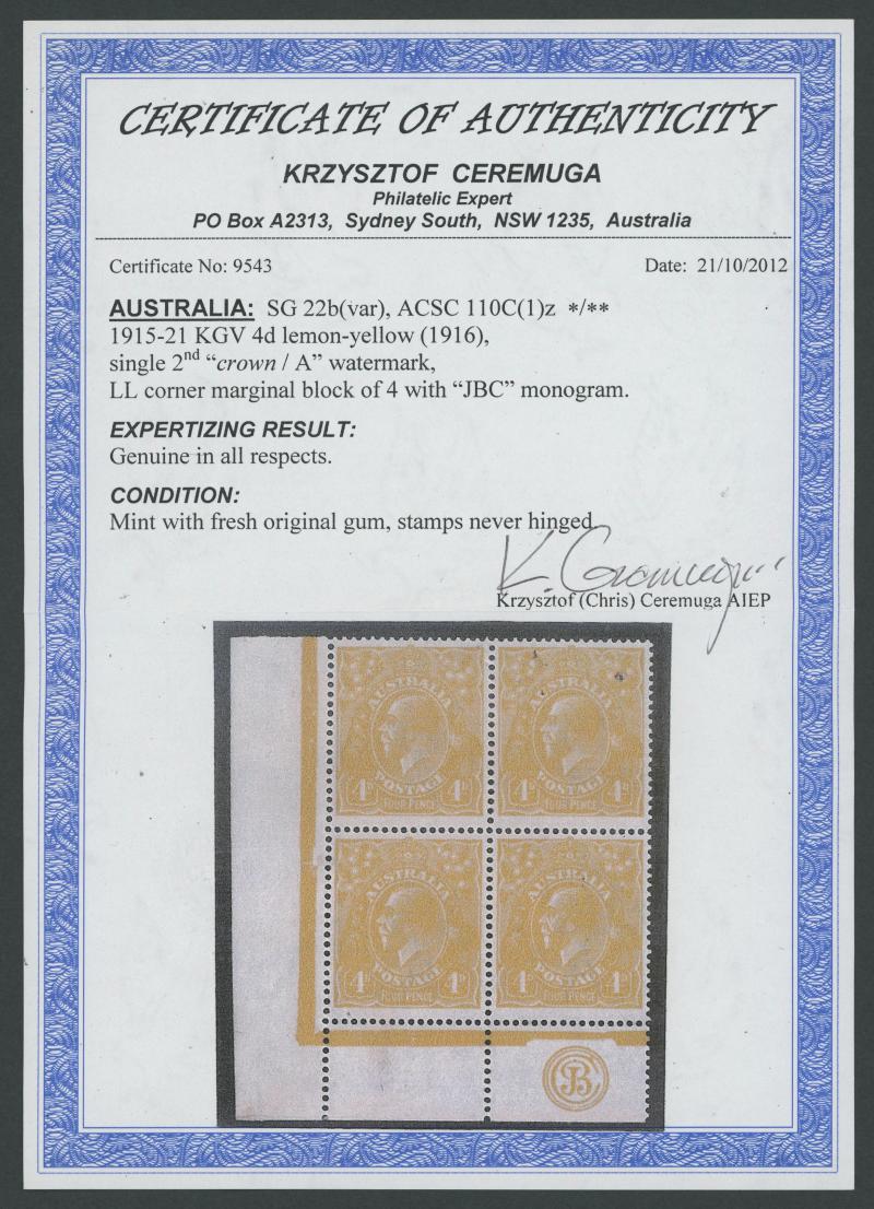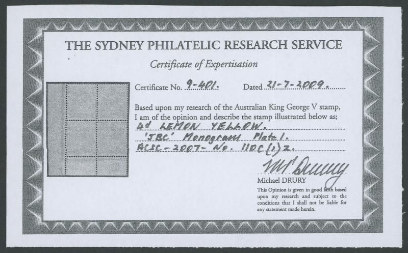 'lemon-yellow' singles. Chris Ceremuga Certificate (2012) plus photocopy of Michael Drury Certificate (2009). Arthur Gray's unmounted block of 6 - a few separated perfs - sold at our auction of 30.10.2015 for $10,710. Ex Gerald Fon. (Image1) (Image2)