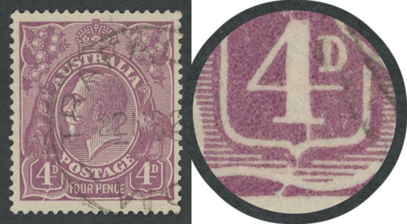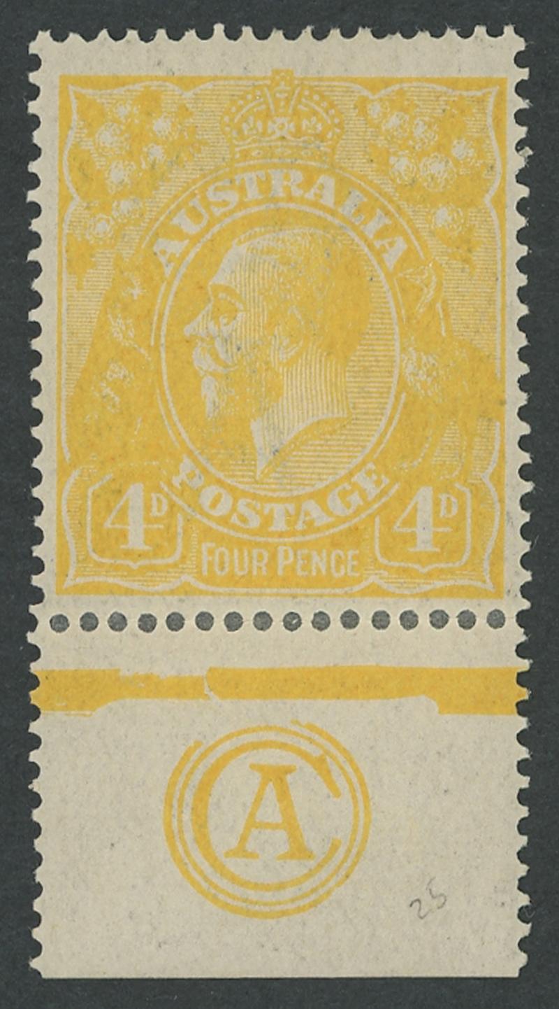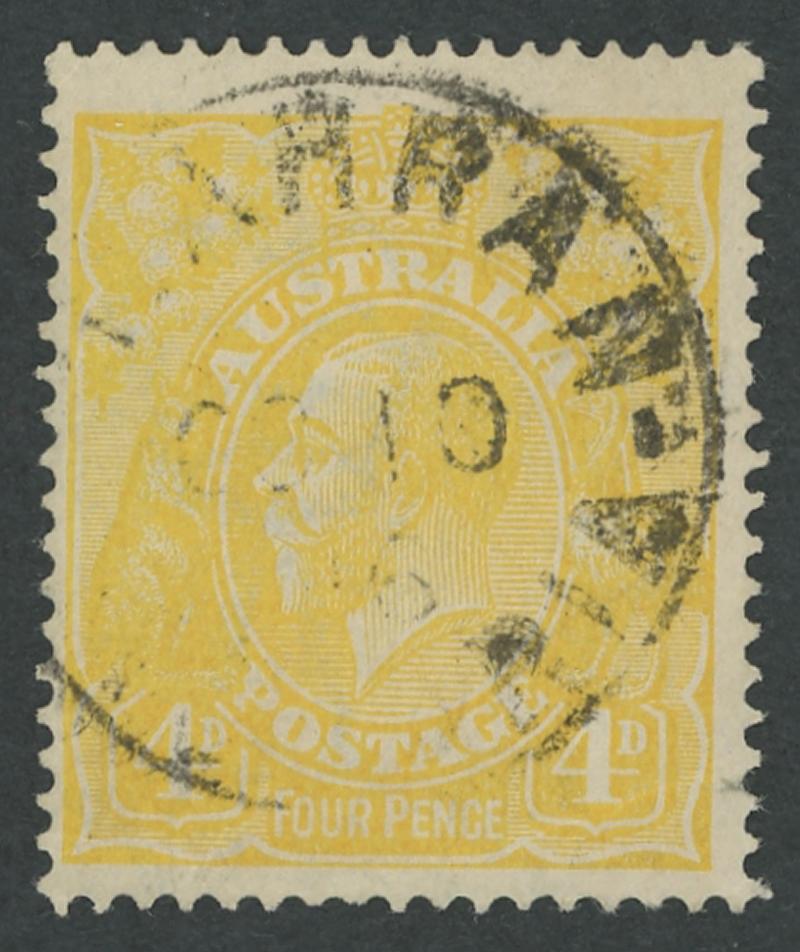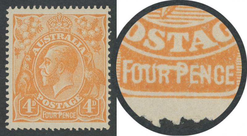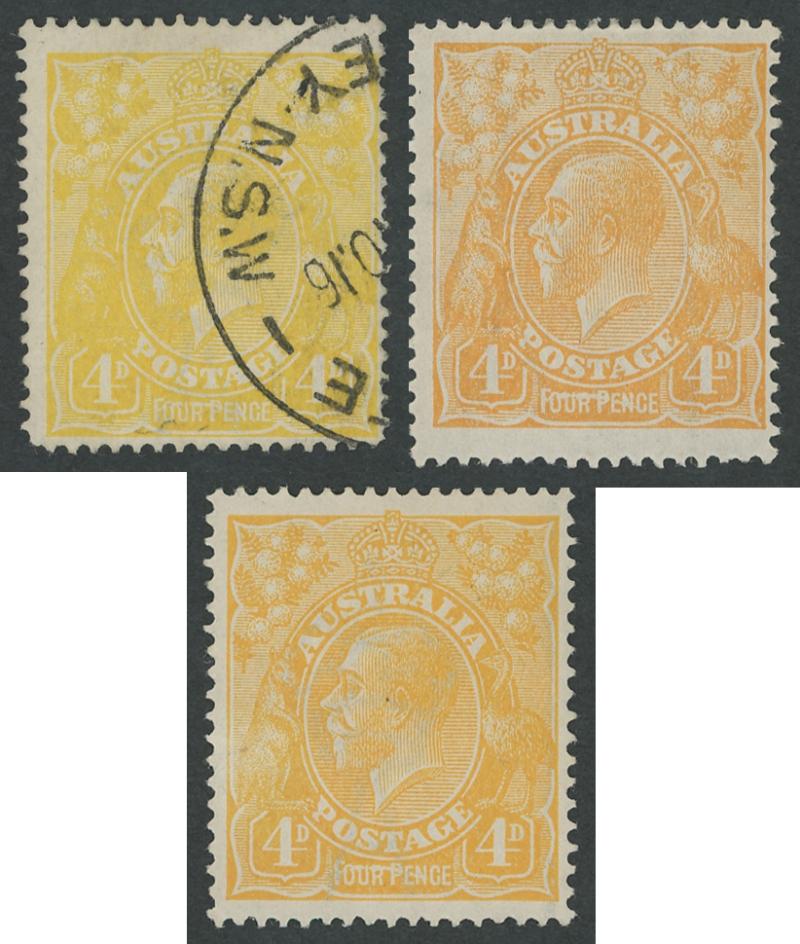 4d orange with Line through 'FOUR PENCE' SG 22e in scarcer shades 4d lemon-yellow ACSC 110C(2)r (SG 22b) with Sydney 1916 cds
