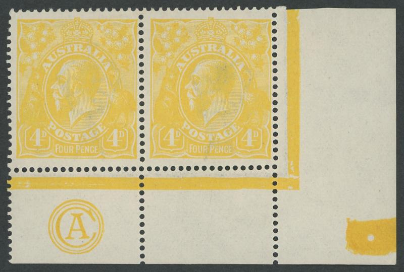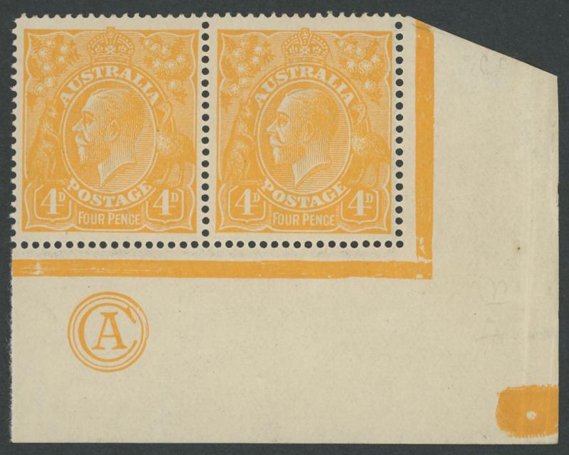 4d yellow-orange SG 22a Plate 2 'CA' Monogram right corner pair ACSC 110B(2)zb, the White Spot over 'FO' of 'FOUR' [Pos 2R59;