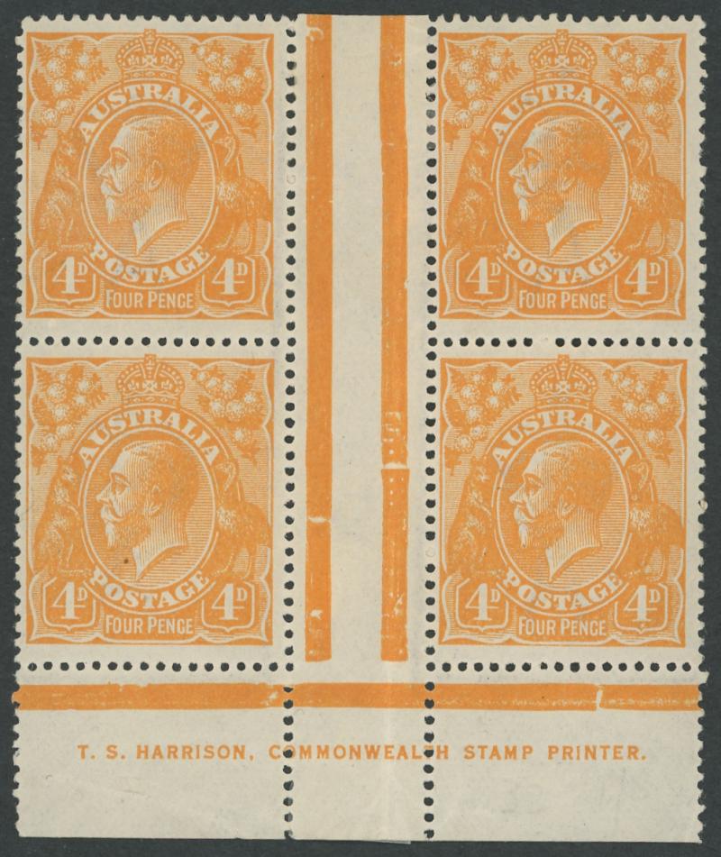 4d orange SG 22 Plate 1 TS Harrison One-Line Imprint (Upper Position; Perforations through Margin) block of 4 ACSC 110A(1)zd, the