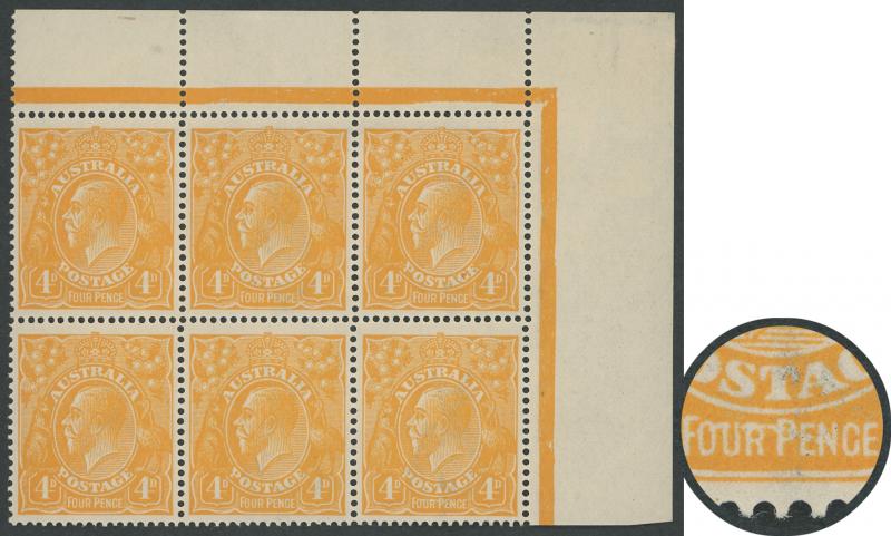 4d bright orange (aniline) with the Watermark Inverted ACSC 110Aa (SG 22w) Plate 2 block of 6 from the upper-right corner of the