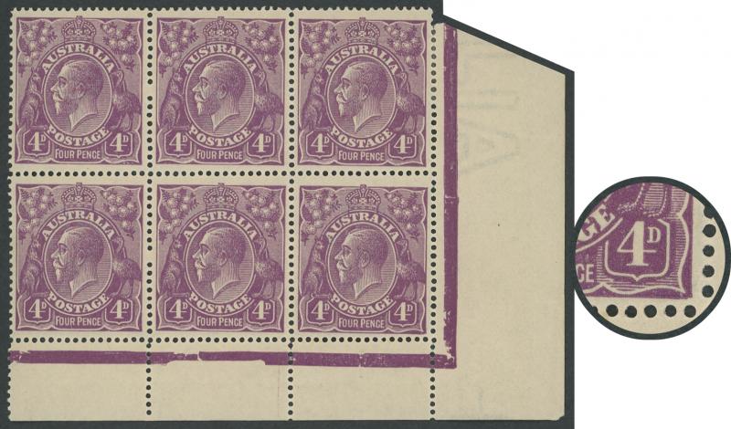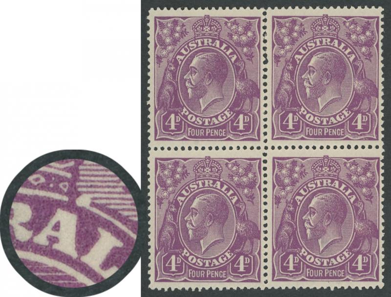 4d violet SG 64 Plate 1 block of 4, the lower-left unit with White Spot over 'AL' of 'AUSTRALIA' [Pos 1R57] ACSC 111(1)p, the other